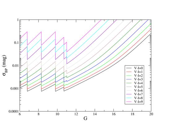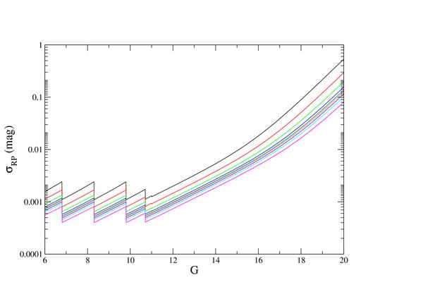 Estimated precisions for one transit on the focal plane and for G, GBP, and GRP with respect to the G magnitude. The shape for bright stars is due to the decrease of the exposure time to avoid saturation of the pixels.
