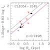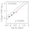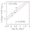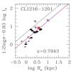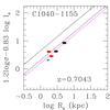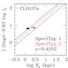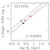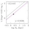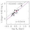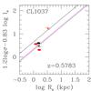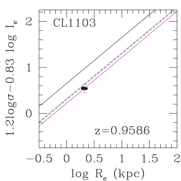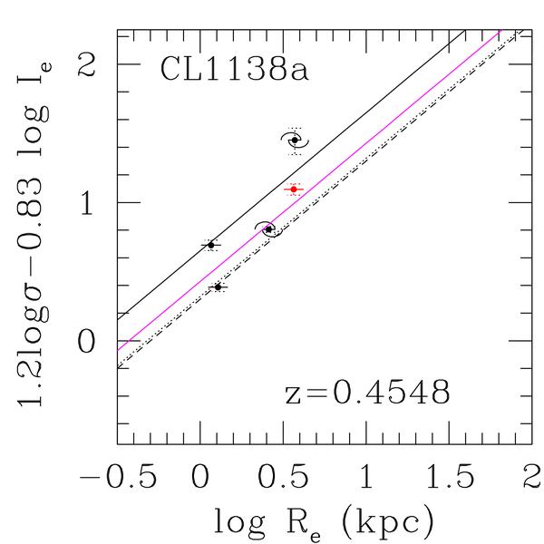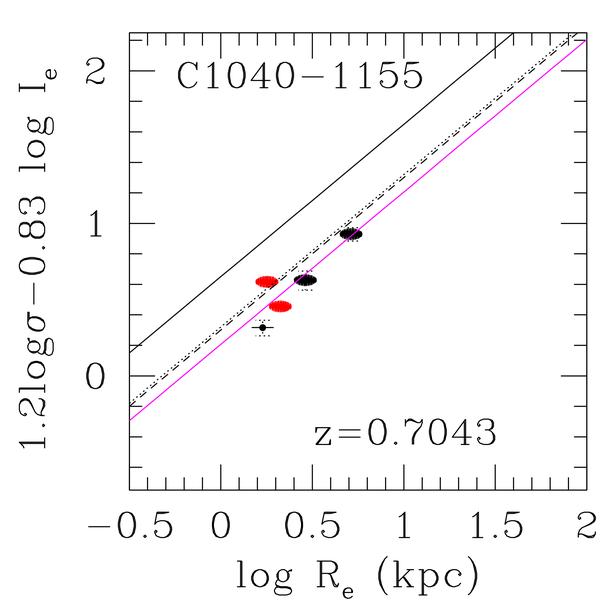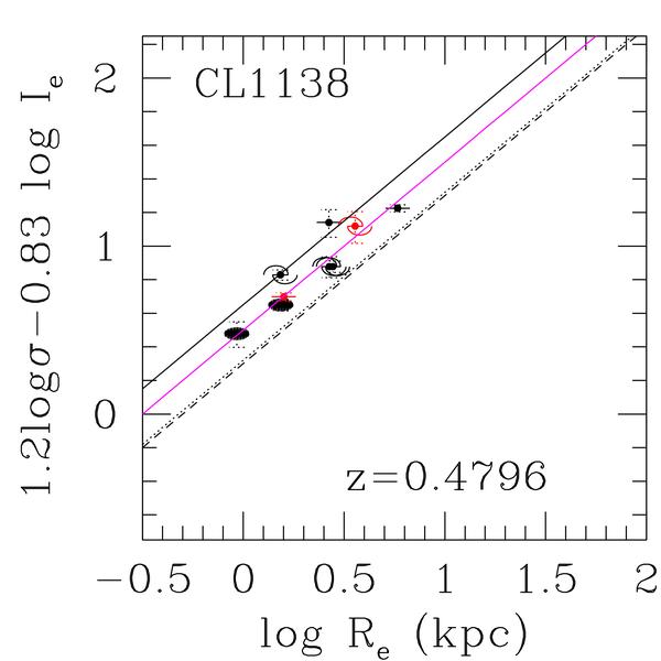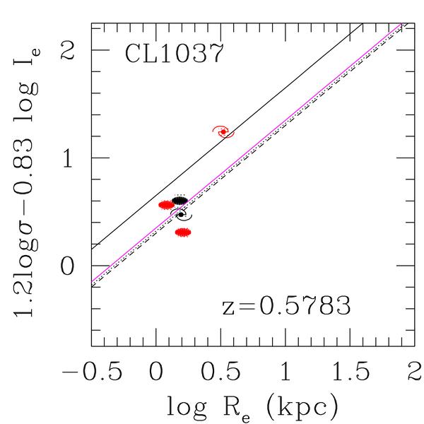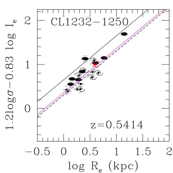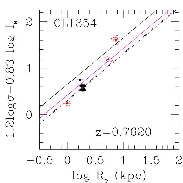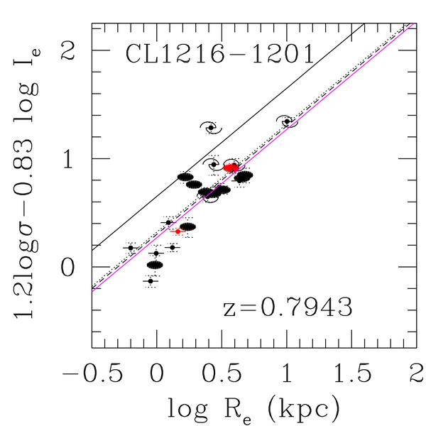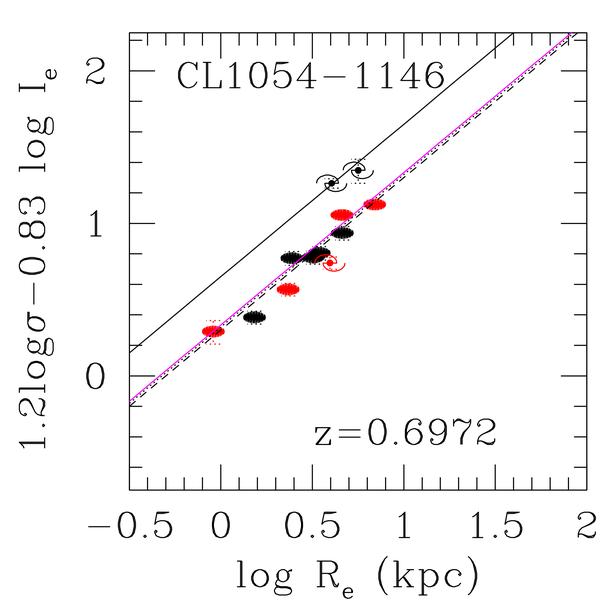 The FP of the EDisCS clusters with HST photometry. Each cluster is identified by its short name for clarity, see Table 4 for the full name. Colors code the spectroscopic type (black = 1, red = 2). Symbols code the morphology: filled ellipses show T ≤ − 4, filled circles crossed by a line − 3 ≤ T ≤ 0, spirals T > 0. The magenta line shows the best-fit FP relation with no selection weighting. The full line shows the Coma cluster at zero redshift. The black dotted and dashed lines show data for the clusters MS2053-04 at z = 0.58 and MS1054-03 at z = 0.83, respectively, from Wuyts et al. (2004).