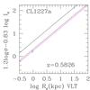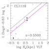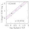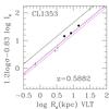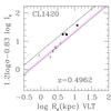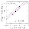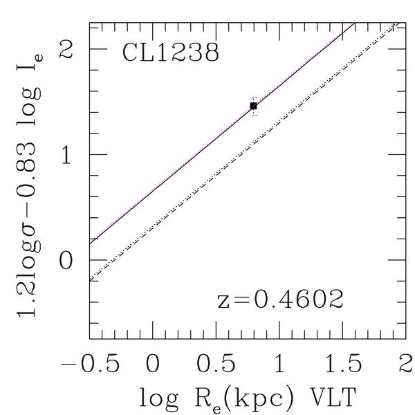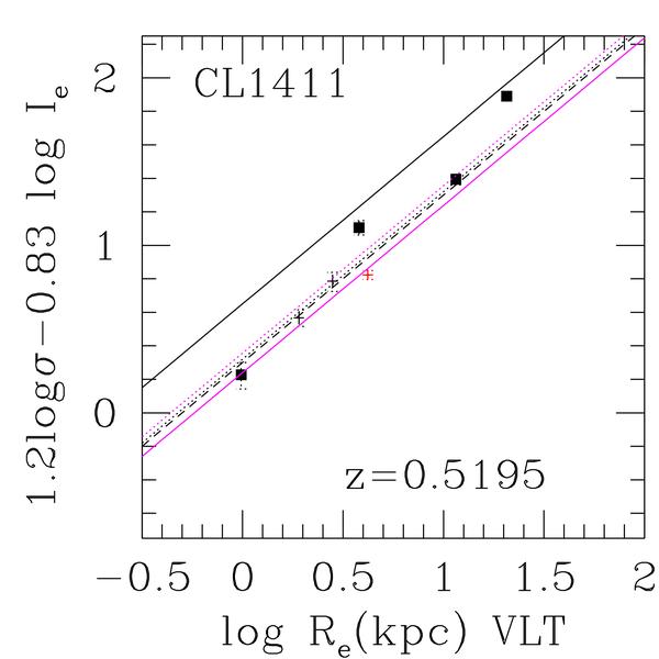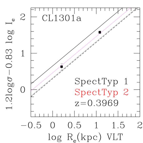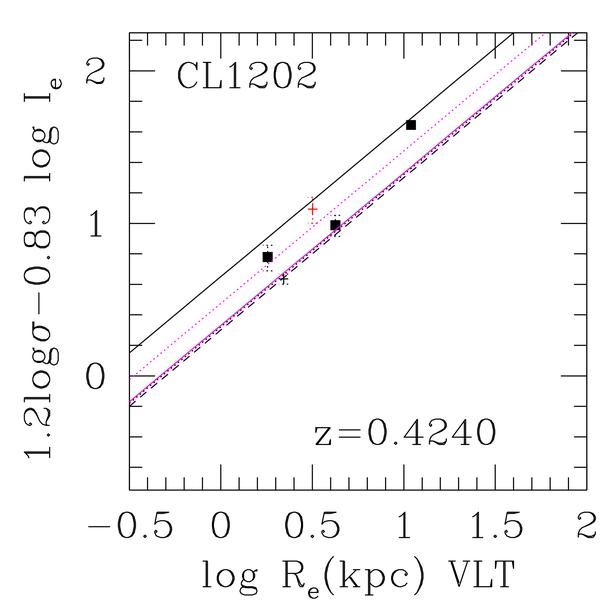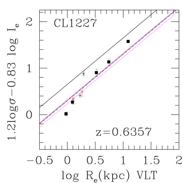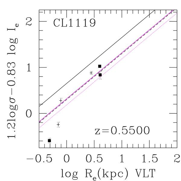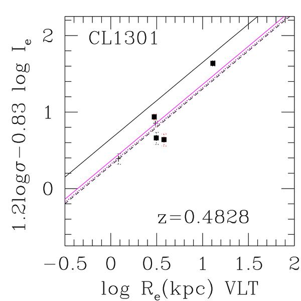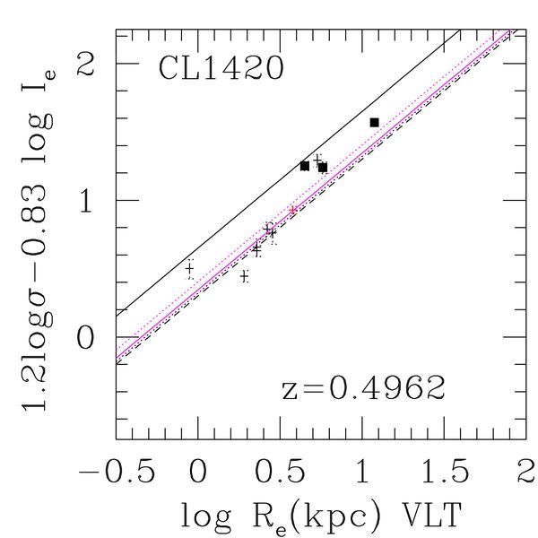 The FP of the EDisCS clusters with VLT only photometry. Each cluster is identified by its short name for clarity, see Table 4 for the full name. Colors code the spectroscopic type. The black squares show galaxies with SExtractor flags different from 0 or 2 and therefore unreliable photometric parameters. The dotted magenta line shows the best-fit FP relation for all galaxies. The solid magenta line shows the best-fit FP relation when considering only galaxies with spectroscopy type ≤ 2 and SExtractor flag 0 or 2. The full line shows the Coma cluster at zero redshift. The black dotted and dashed lines show the clusters MS2053-04 at z = 0.58 and MS1054-03 at z = 0.83 from Wuyts et al. (2004), respectively.