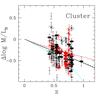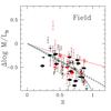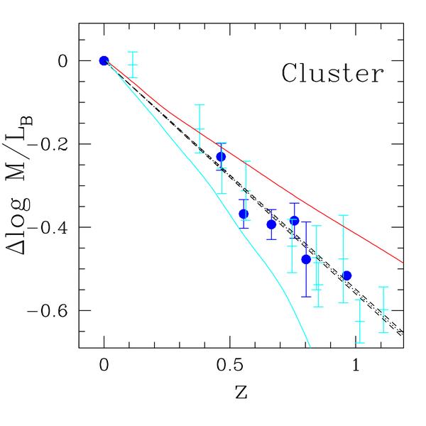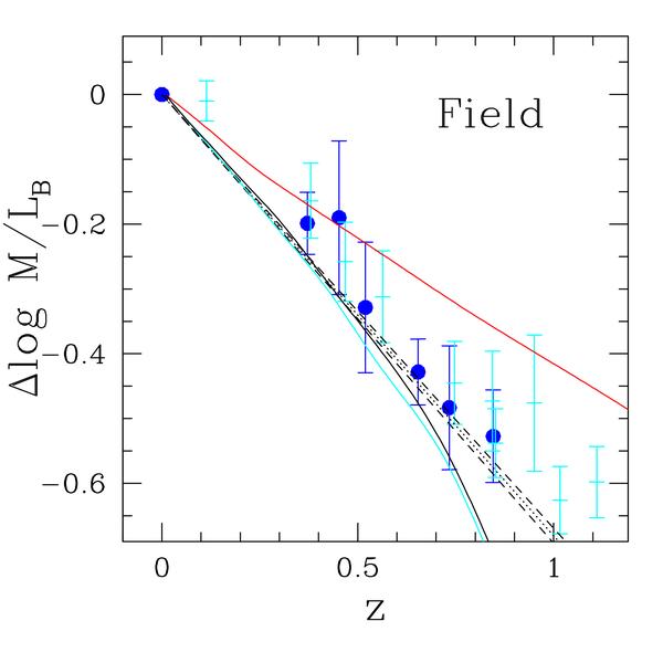 The redshift evolution of the mass-to-light ratio for cluster (left) and field (right) galaxies. Top: black and red indicate galaxies with spectroscopic types 1 and 2, respectively. Morphologies for galaxies with HST photometry are coded as in Fig. 14. Galaxies with VLT photometry only are shown as crosses. Only galaxies with good VLT photometry (i.e., SExtractor flag 0 or 2) are plotted. The solid black lines show the solar metallicity SSP for zf = 2 (cluster) and zf = 1.2 (field). The solid red line shows the SSP for zf = 3.5 and half-solar metallicity, the cyan line shows the SSP for zf = 1.2 and twice-solar metallicity. The dotted line shows the best-fit linear relation (−0.55z for cluster and −0.76z for field galaxies) and the 1σ errors dashed. Bottom: the blue points show averages over redshift bins 0.1 wide. The cyan points are average field galaxies from van Dokkum & van der Marel (2007). Only field galaxies (plot to the right) with dynamical masses higher than 1011 M⊙ are considered.