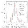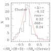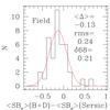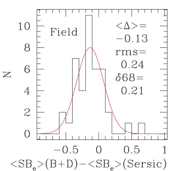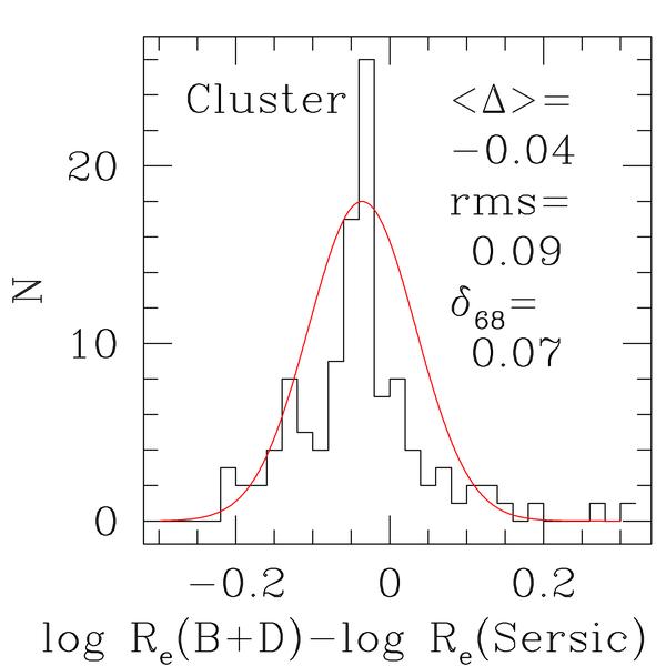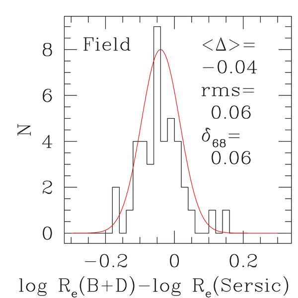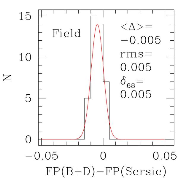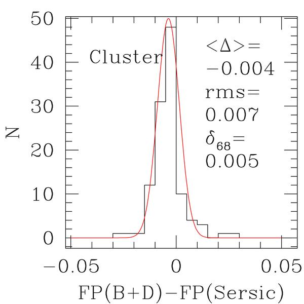 The quality of the photometry parameters derived from HST images for cluster (left) and field (right) galaxies. We show histograms of the differences between structural parameters derived from bulge plus disk (B+D) and Sersic GIM2D fits to the HST ACS images of the galaxies with measured velocity dispersions. The mean, rms, and the widths at the 68% percentile of the distributions are given.
