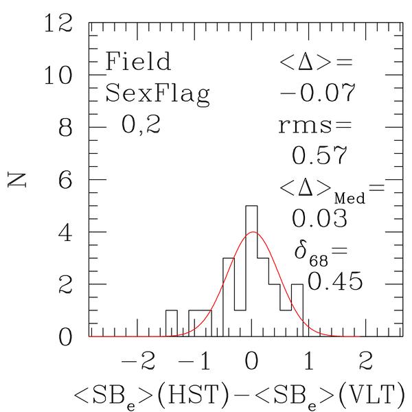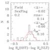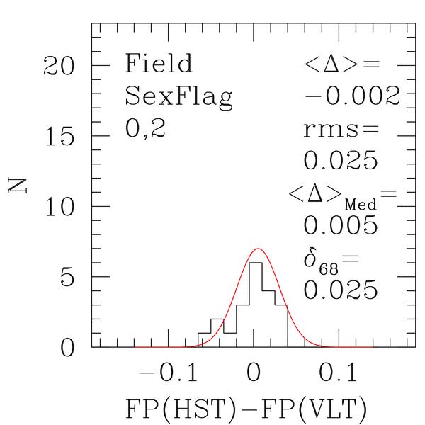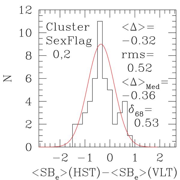 The quality of the photometry parameters derived from VLT images for cluster (left) and field (right) galaxies. Histograms of the differences between structural parameters derived from bulge plus disk GIM2D fits to the HST ACS and VLT I band images of the isolated, undisturbed galaxies with measured velocity dispersions. The mean, rms, and the widths at the 68% percentile of the distributions are given.
