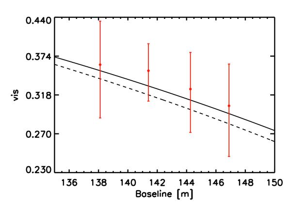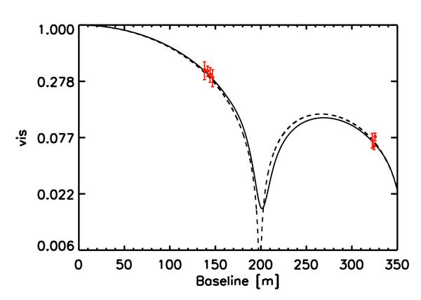 Comparison of the RHD simulation with [Fe/H ] = 0. and log g = 2.2 (Table 1) to the observations (red dots) of the giant HD 214868 (Baines et al. 2010). The solid thick line corresponds to the best fit (reduced χ2 = 0.59) visibility curve, the dashed line is the uniform disk (2.721 mas with reduced χ2 = 0.72) model introduced by Baines et al.. The visibility curve from RHD simulation never goes to zero due to the bandwidth smearing effect. A logarithm scale is used on y-axis.