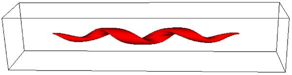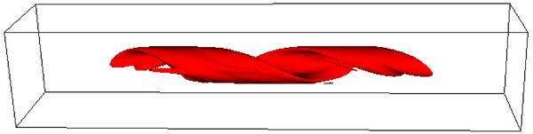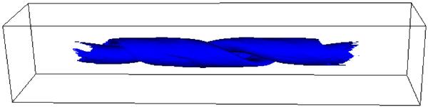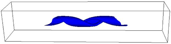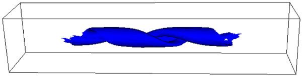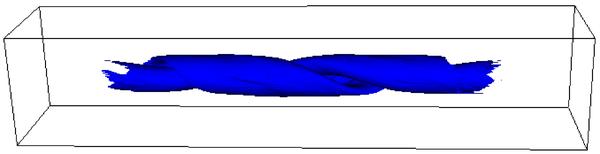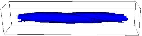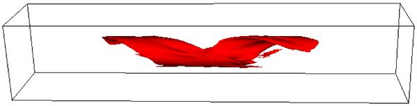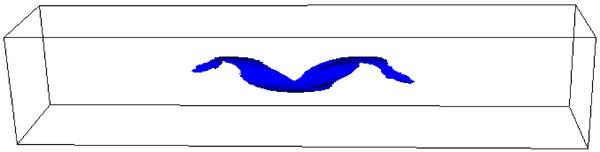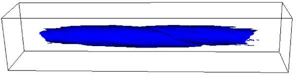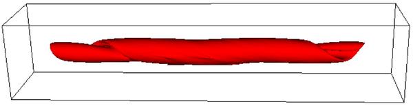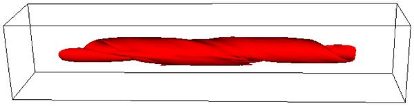 Isosurfaces of the normalised temperature T = 7.5 × 10-4, with the blue isosurfaces (left hand column) obtained without thermal conduction and the red isosurfaces (right hand column) with thermal conduction. At times 90 and 125 for the case with thermal conduction there is no plasma at this temperature and hence no isosurface is shown.