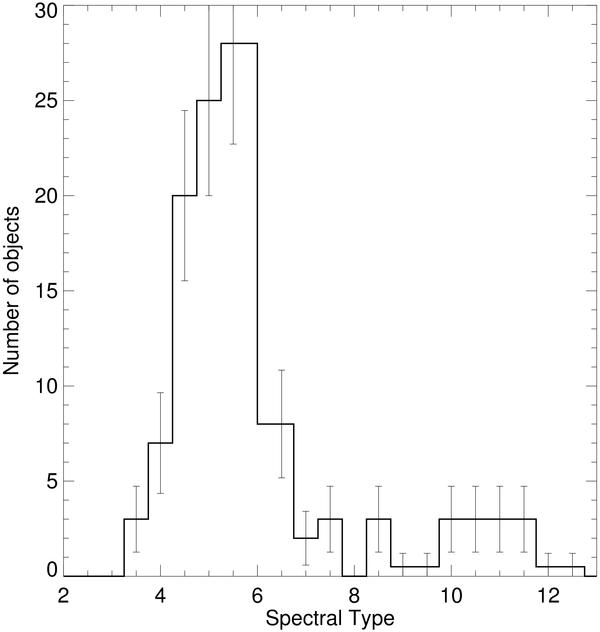 Luminosity function or number of USco spectroscopic members as a function of spectral types (4 ≡ M4, 5 ≡ M5, etc.).