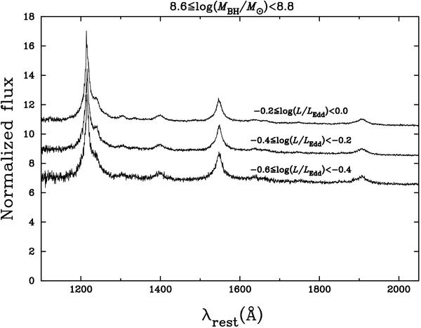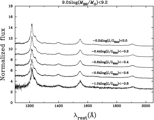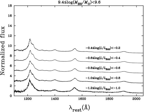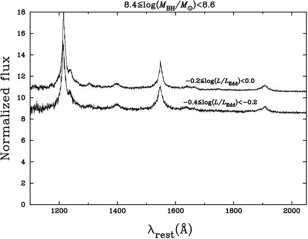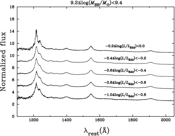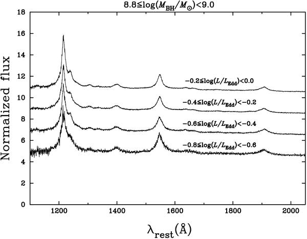 Composite spectra in a fixed interval of MBH by varying the Eddington ratio. The height scale is the same for all spectra, but different spectra are shifted by two.