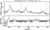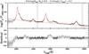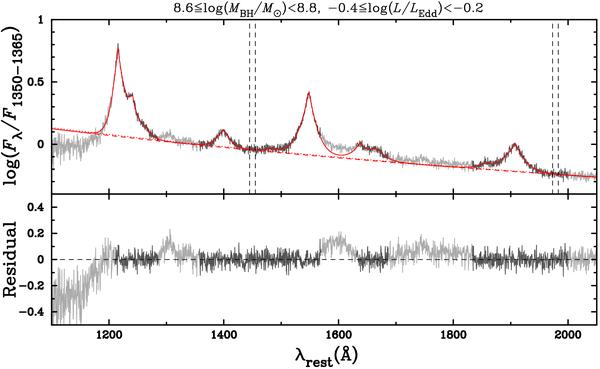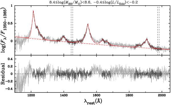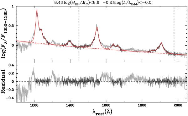 Composite spectra of each quasar subsample and fitting results, shown in the logarithmic scale (upper panels). The residuals are shown in the lower panels. Dark gray lines show the wavelength regions used for the fitting, while the wavelength regions excluded from the fitting process are shown in light gray. The spectral regions denoted by vertical dashed lines are used to determine the initial guess of the continuum level and slope in the fitting process. The initial guess and the fitted power-law continuum are denoted by red dotted and dashed lines, respectively.