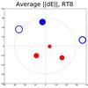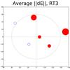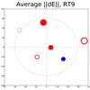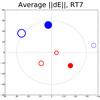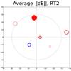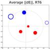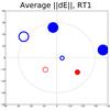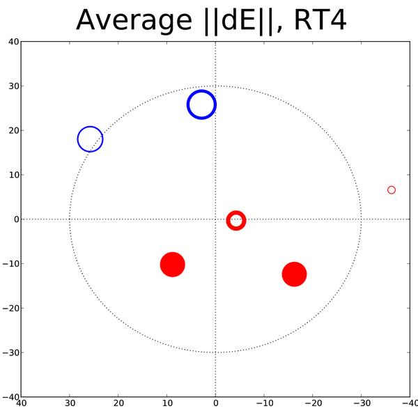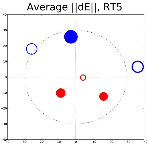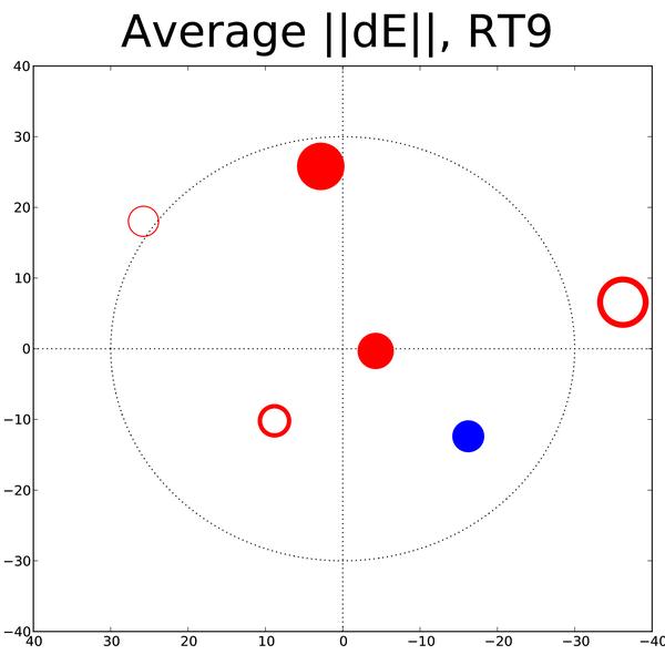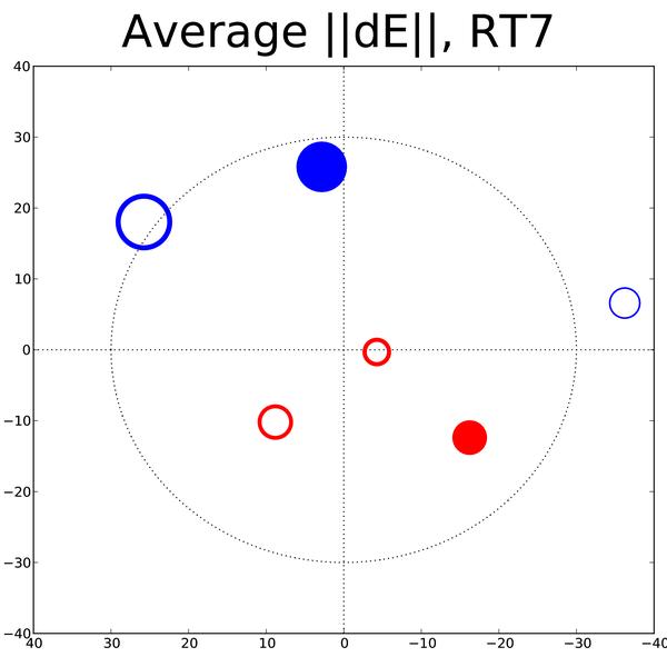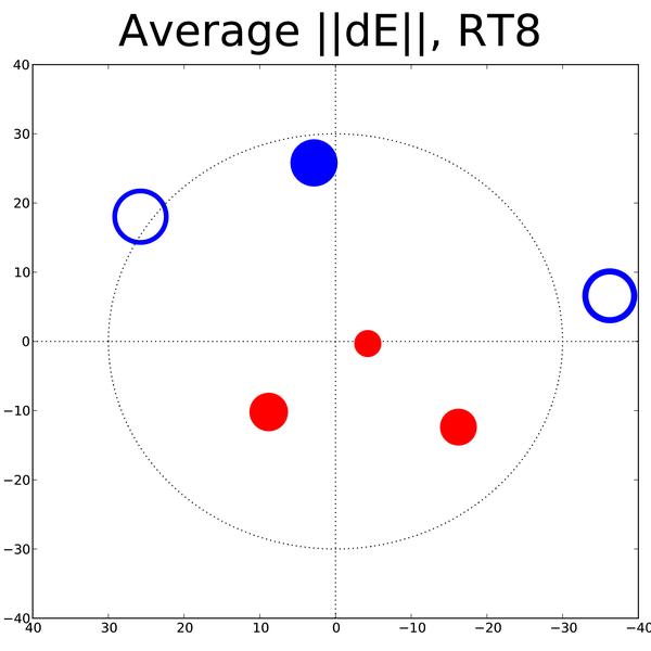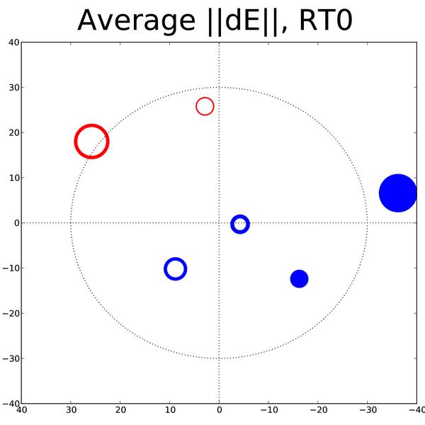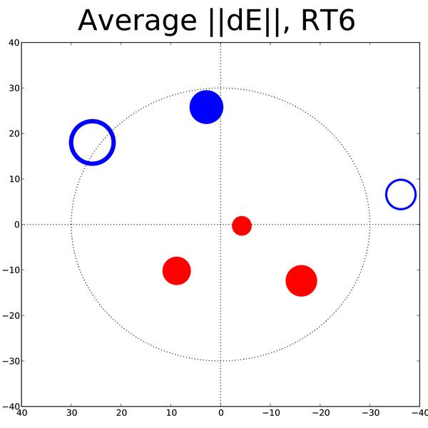 “Rogues gallery” plot for the 2003 observation. This shows the 12-h average ||ΔE|| per source, as seen by each antenna. Blue circles correspond to values of ||ΔE|| > 1, red circles to values of ||ΔE|| < 1, and areas are proportional to | || ΔE|| −1 | . Line thickness indicates the statistical significance of | || ΔE || −1 |; filled circles are for detections of over 3σ. The large grid circle is at radius 30′.