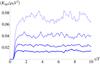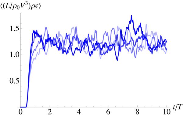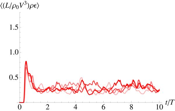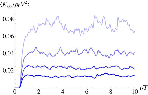 Temporal evolution of the SGS turbulence energy (top) and the dissipation rate (bottom) for solenoidal (left column) and compressive forcing (right column). The cutoff length Δ decreases from L/32 (light colour) to L/256 (full colour).