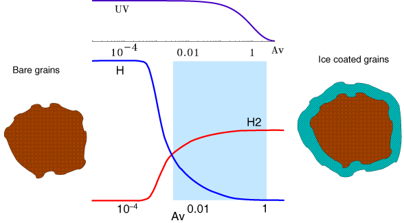 The figure is adapted from Le Petit et al. (2006). The blue zone emphasises the transition zone between atomic and molecular hydrogen.