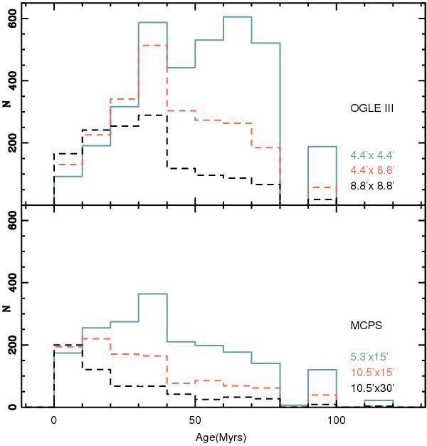 The statistical distribution of LSFE ages of the LMC. Upper panel shows OGLE III data and lower panel shows MCPS data, with the three colors corresponding to different area, as specified in the figure.