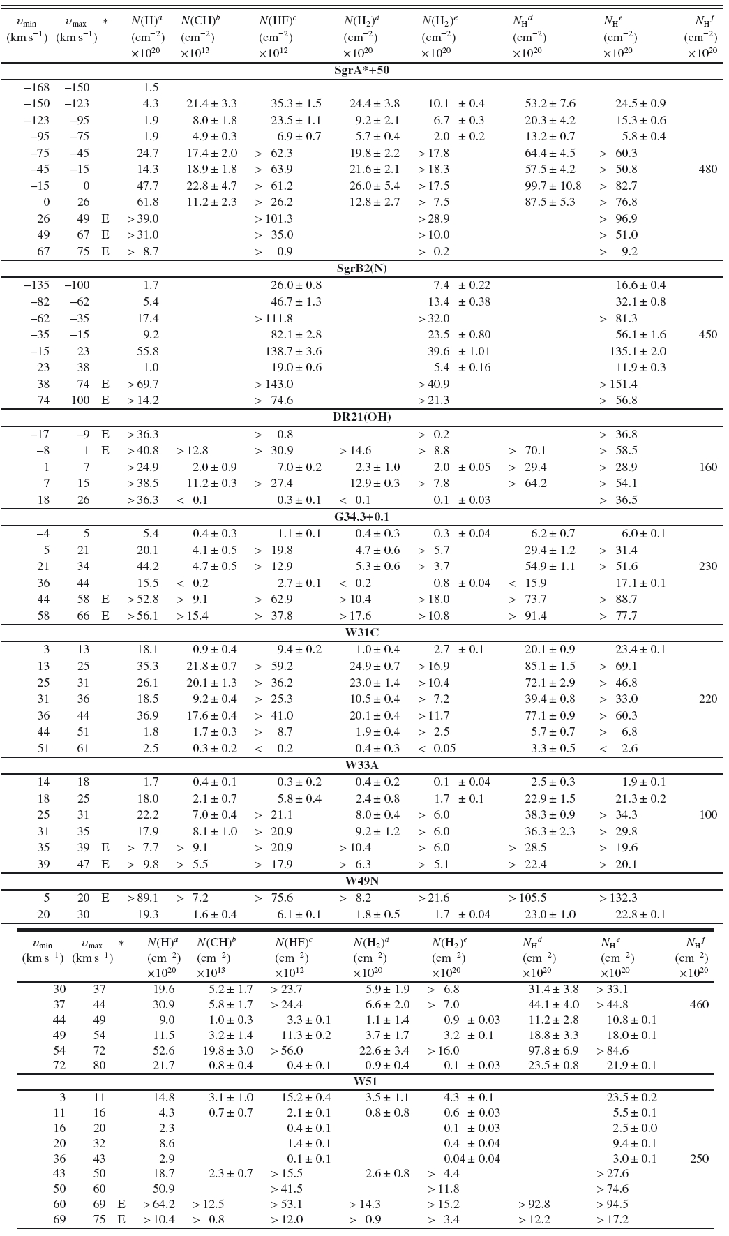 Notes. (∗) E = absorption line profile observed in the star-forming region; Tex may be underestimated, hence the lower limit on N(HF), and N(CH). (a) From the observations with the VLA interferometer by Koo (1997), Fish et al. (2003), Pandian et al. (2008), Dwarakanath et al. (2004), and Lang et al. (2010) assuming a spin temperature of 100 K. (b) From (Gerin et al. 2010b; Gerin et al., in prep.). (c) From (Neufeld et al. 2010b; Sonnentrucker et al. 2010; Neufeld et al., in prep.; Sonnentrucker et al., in prep.). (d) Estimate from the observation of the CH absorption lines, a mean value of the HF/CH column density ratio of 0.4 (inferred from Cols. 5 and 6) and an abundance ratio n(HF)/n(H2) = 3.6 × 10-8, as predicted by UV-dominated chemical models (see Appendix C). (e) Estimate from the observation of the HF absorption lines and an abundance ratio n(HF)/n(H2) = 3.6 × 10-8, as predicted by UV-dominated chemical models (see Appendix C). (f) Estimate of NH integrated over the entire line of sight from models of the extinction at 2 μm by Marshall et al. (2006). In the last column, the total hydrogen column densities are estimated over the entire sight line.