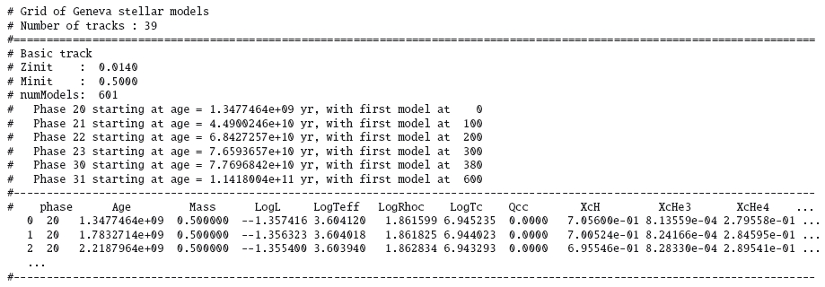 a to f: Basic tracks at Zinit = 0.006, 0.01, 0.014, 0.02, 0.03, 0.04, respectively. Only a portion of table c is shown. See text for a description of the column.