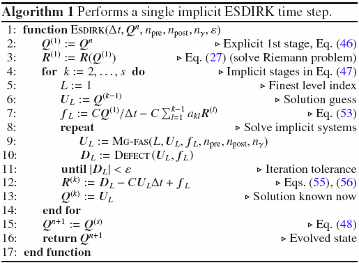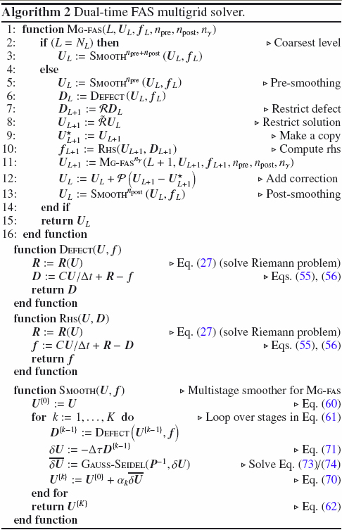 We note the recursive nature of Mg-fas, which calls itself to operate on a coarser grid level every time one executes line 11. Lines 6–12 constitute the coarse grid correction, which is skipped, of course, on the coarsest grid L = NL. There, the solution is approximated by performing npre + npost steps with the smoothing algorithm. We also note that the solution of a Riemann problem is required (cf. Eq. (27)) every time the spatial residual, R(U), or the defect, D(U), need to be evaluated for some given input state U. The main place in the algorithm where multiple Riemann solutions are performed is the multistage smoother Smooth.