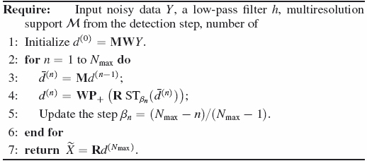 is a global minimizer of Eq. (21). We recall that ∥·∥ 1 = ∑ j1,j2,kr,kt | dj1,j2 [kr,kt] | is the ℓ1-norm playing the role of regularization and is well-known to promote sparsity (Donoho 2004). This problem can be solved efficiently using the hybrid steepest descent algorithm (Yamada 2001; Zhang et al. 2008), and requires about ten iterations in practice. Transposed into our context, its main steps can be summarized as follows: