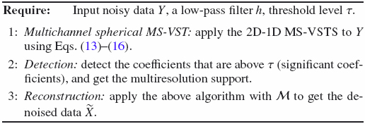 The same recipe as in the monochannel case applies with the notable difference that the spherical 2D-1D MS-VSTS is used instead of its monochannel counterpart. The multichannel multiresolution support ℳ is obtained after thresholding these coefficients.