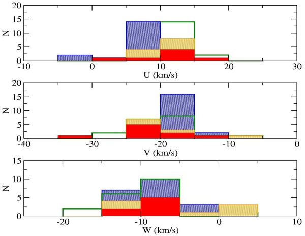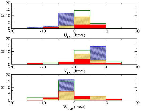 Histograms of space velocities, uncorrected and corrected for the solar reflex motion with respect to the LSR (left and right panels, respectively) for stars in the different Chamaeleon associations. Symbols as in Fig. 2.
