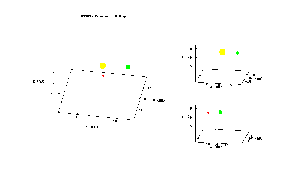 Three-dimensional evolution of the orbit of 83982 Crantor (2002 GO9) in three different frames of reference: heliocentric (left), frame co-rotating with Uranus but centered on the Sun (top-right), and uranocentric (bottom-right). The red point is (83982) Crantor, the green one is Uranus, and the yellow one is the Sun. The osculating orbits are outlined and the viewing angle changes slowly to facilitate visualizing the orbital evolution. Still from the animated figure available online only.