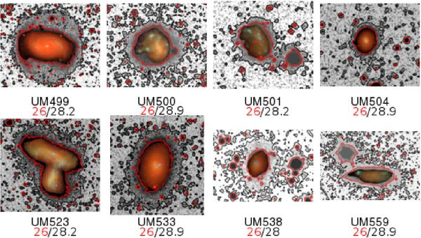 Extreme contours. Numbers in red/black indicate the isophotal level of the red/black contour in mag arcsec-2.