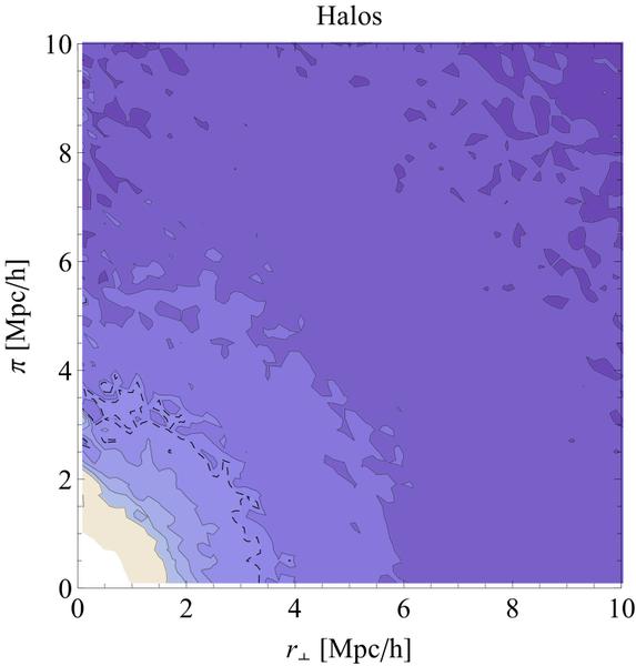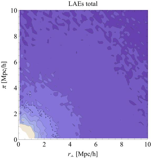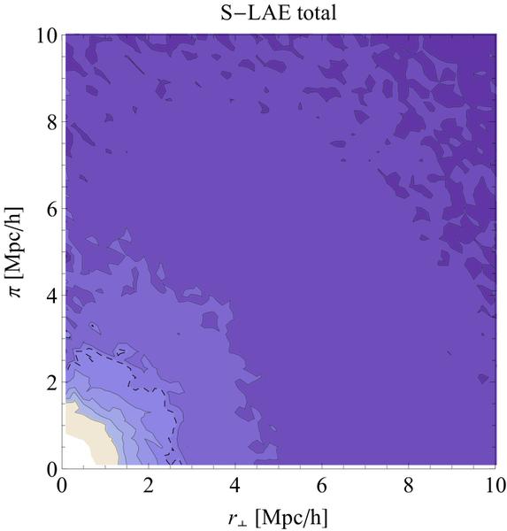 2PCF as a function of line of sight (π) and perpendicular distance (r⊥) for halos (left plot), observed LAEs (middle), and S-LAE sample (right) in real space at z = 4. The dashed contours correspond to ξ = 1, contours are separated by 0.4. The number density of all threshold samples is 4 × 10-2 Mpc-3 h3. The plots were averaged over three different lines of sight to reduce cosmic variance.