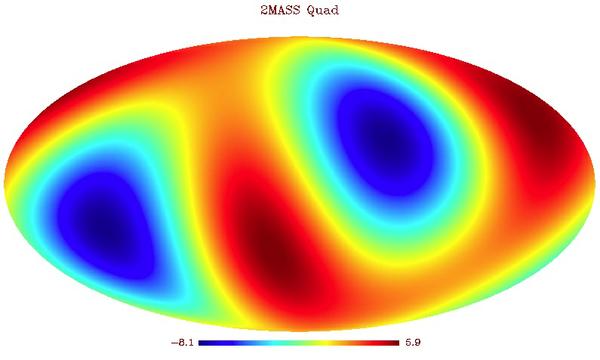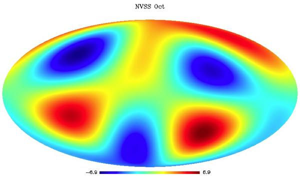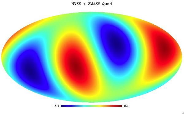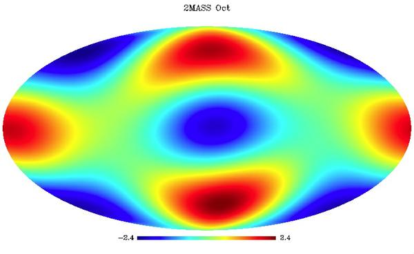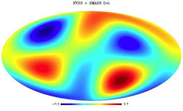 Quadrupole (left) and octopole (right) of the reconstructed ISW map for 2MASS (top) and NVSS (middle) and both NVSS and 2MASS together (bottom). The quadrupole and octopole of the ISW map due to 2MASS galaxies can be compared with that obtained by Francis & Peacock (2010, top of their Fig. 3). Maps are shown in units of μK.