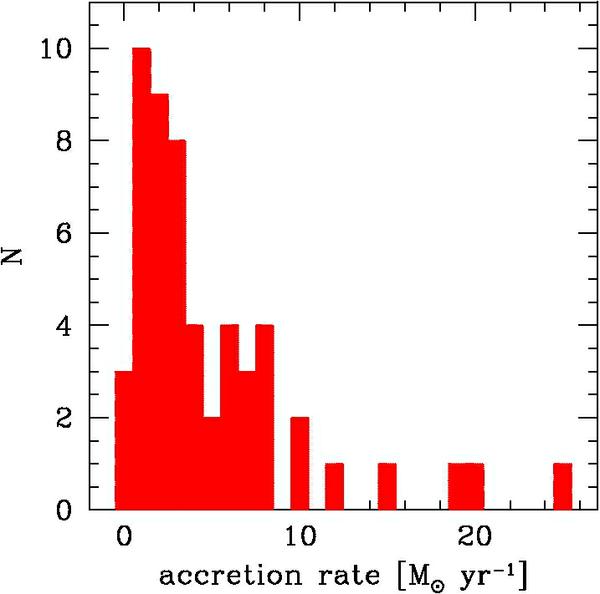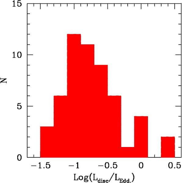 Distributions of the accretion rate a) and of the Eddington ratio b) for the our FSRQs with evidence of a blue bump.