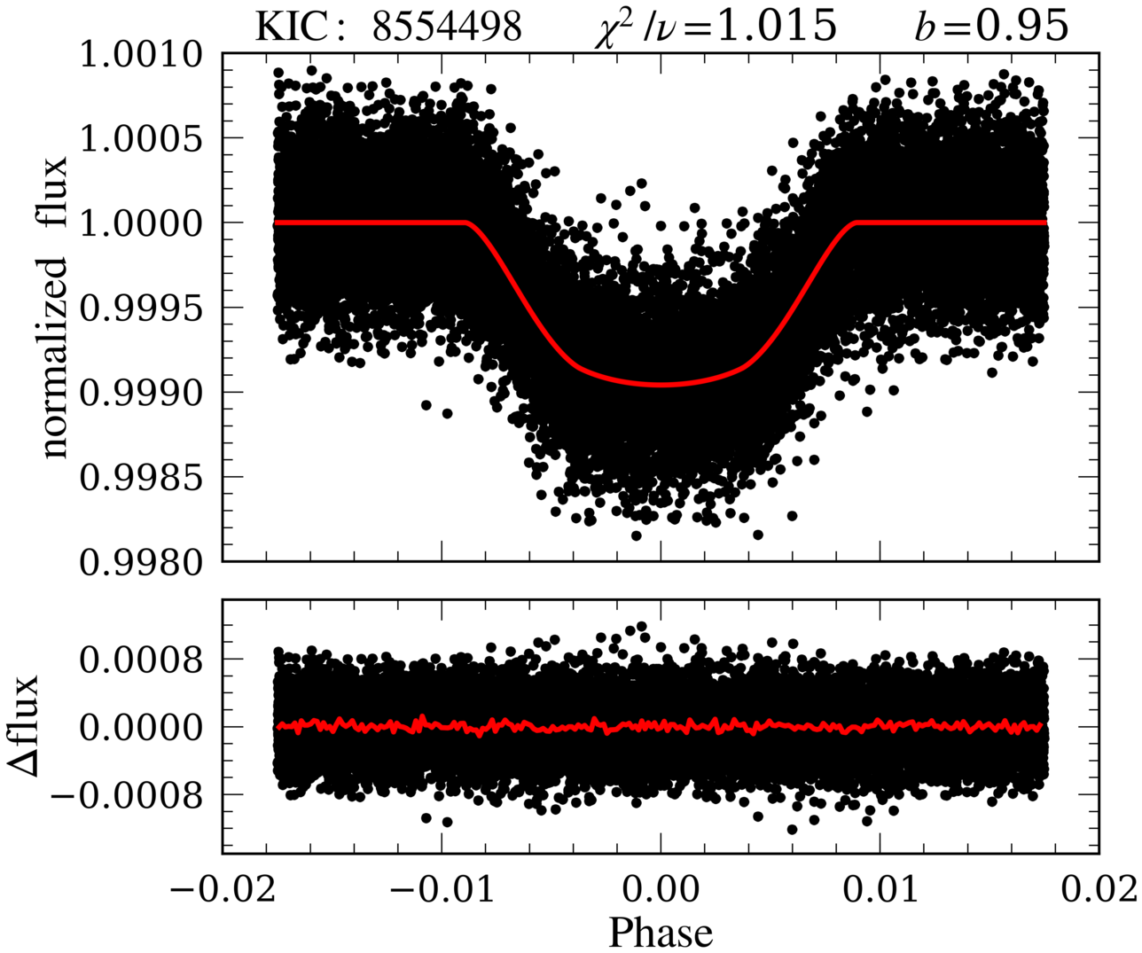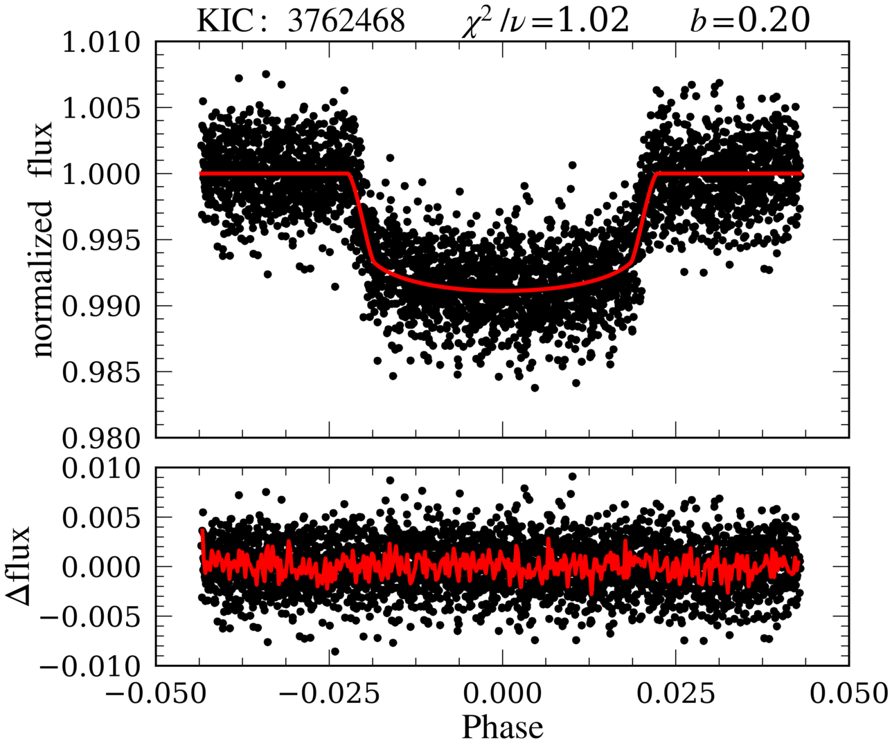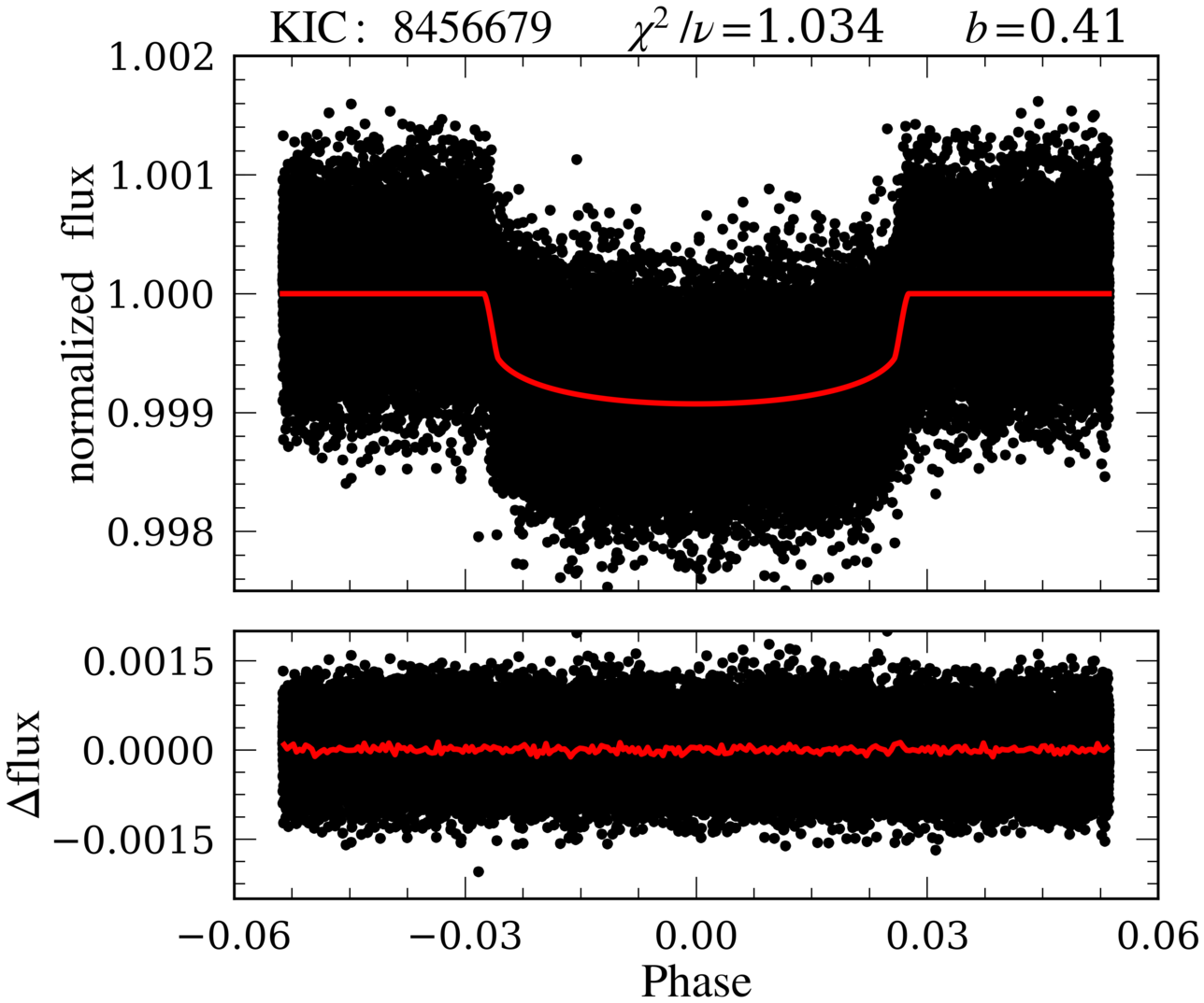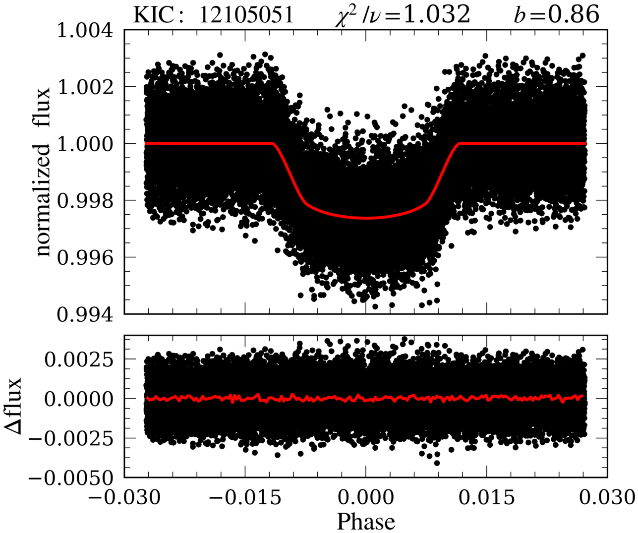 Top panels: normalized, phase folded transit light curves and best-fit models for the object sample with high impact parameters (Table 2). Bottom panels: residuals for individual data points and overplotted rebinned residuals (red) with one minute bin time. Objects ordered by Teff from the upper left to the lower right corner.