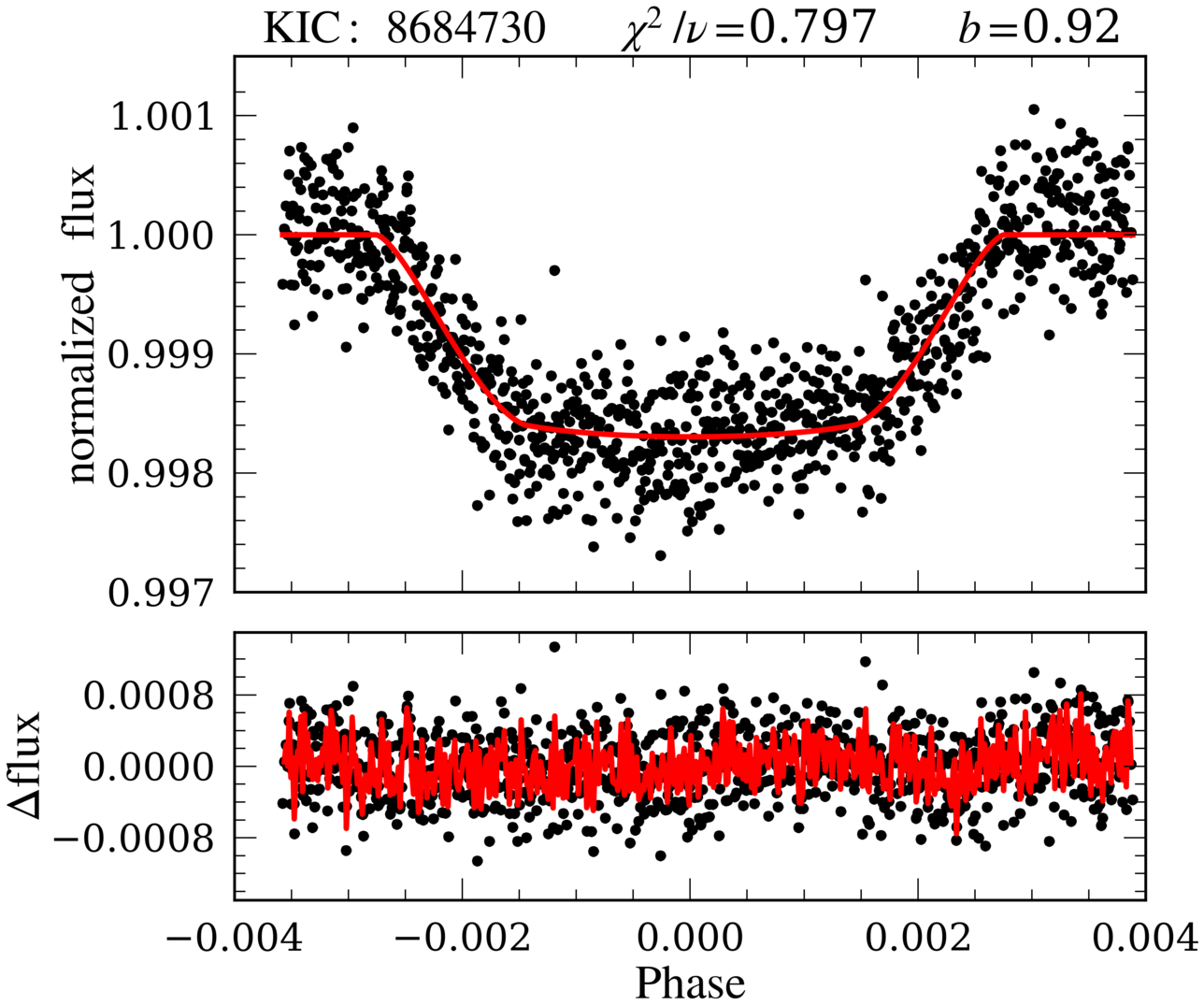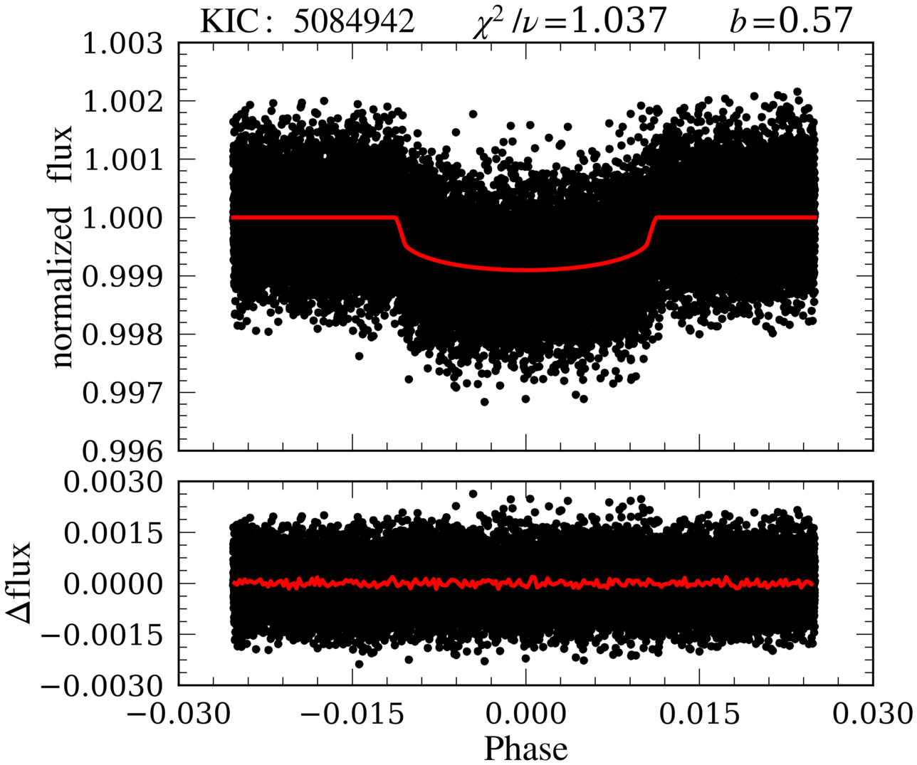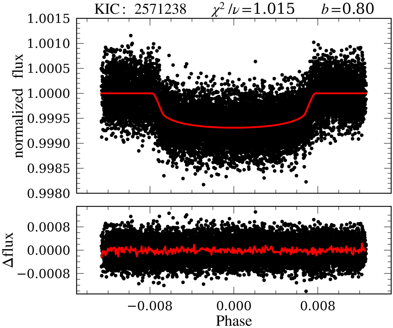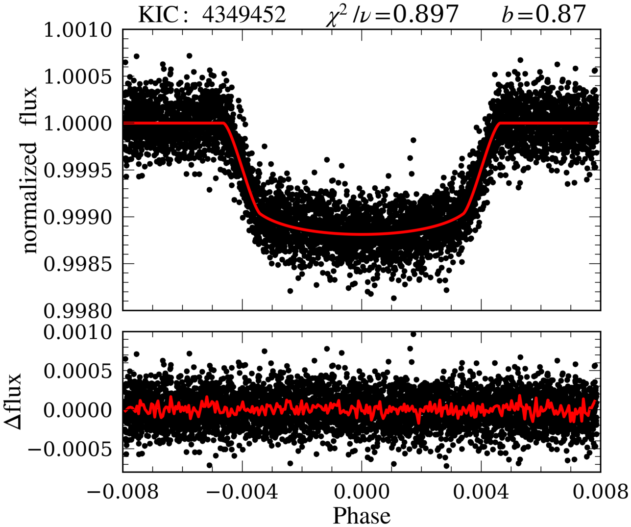 Top panels: normalized, phase folded transit light curves and best-fit models for the object sample with high impact parameters (Table 2). Bottom panels: residuals for individual data points and overplotted rebinned residuals (red) with one minute bin time. Objects ordered by Teff from the upper left to the lower right corner.