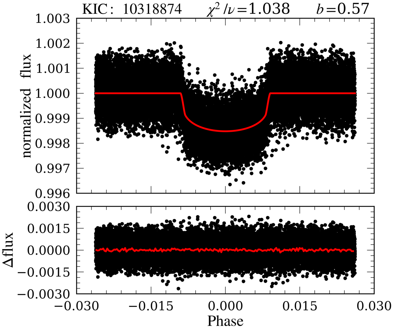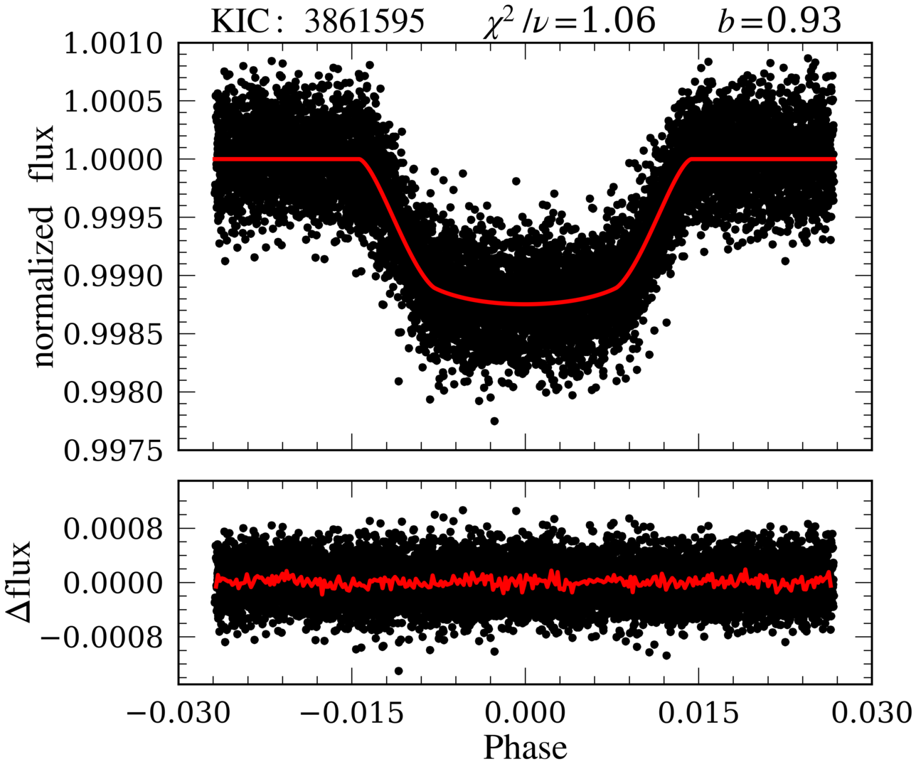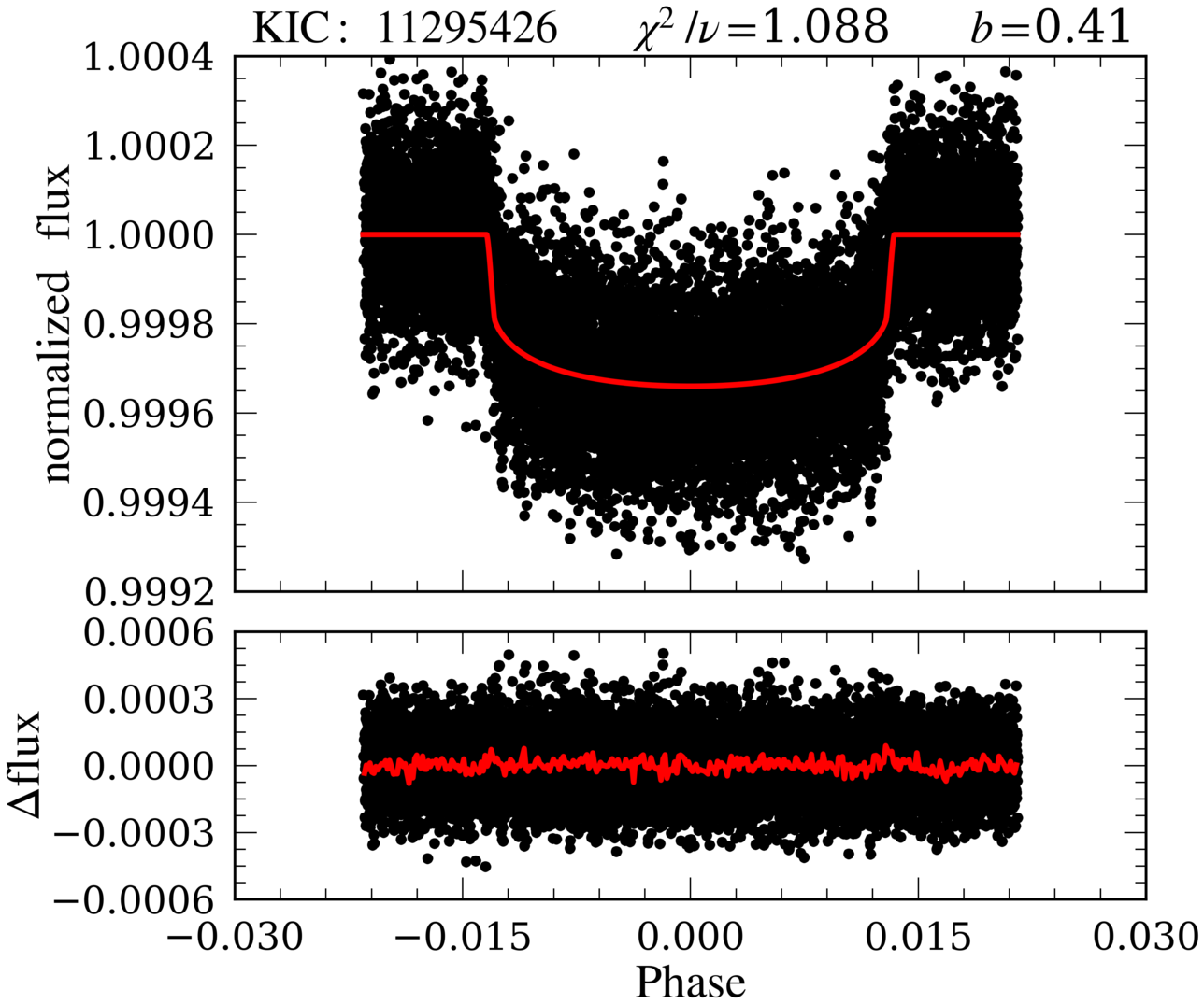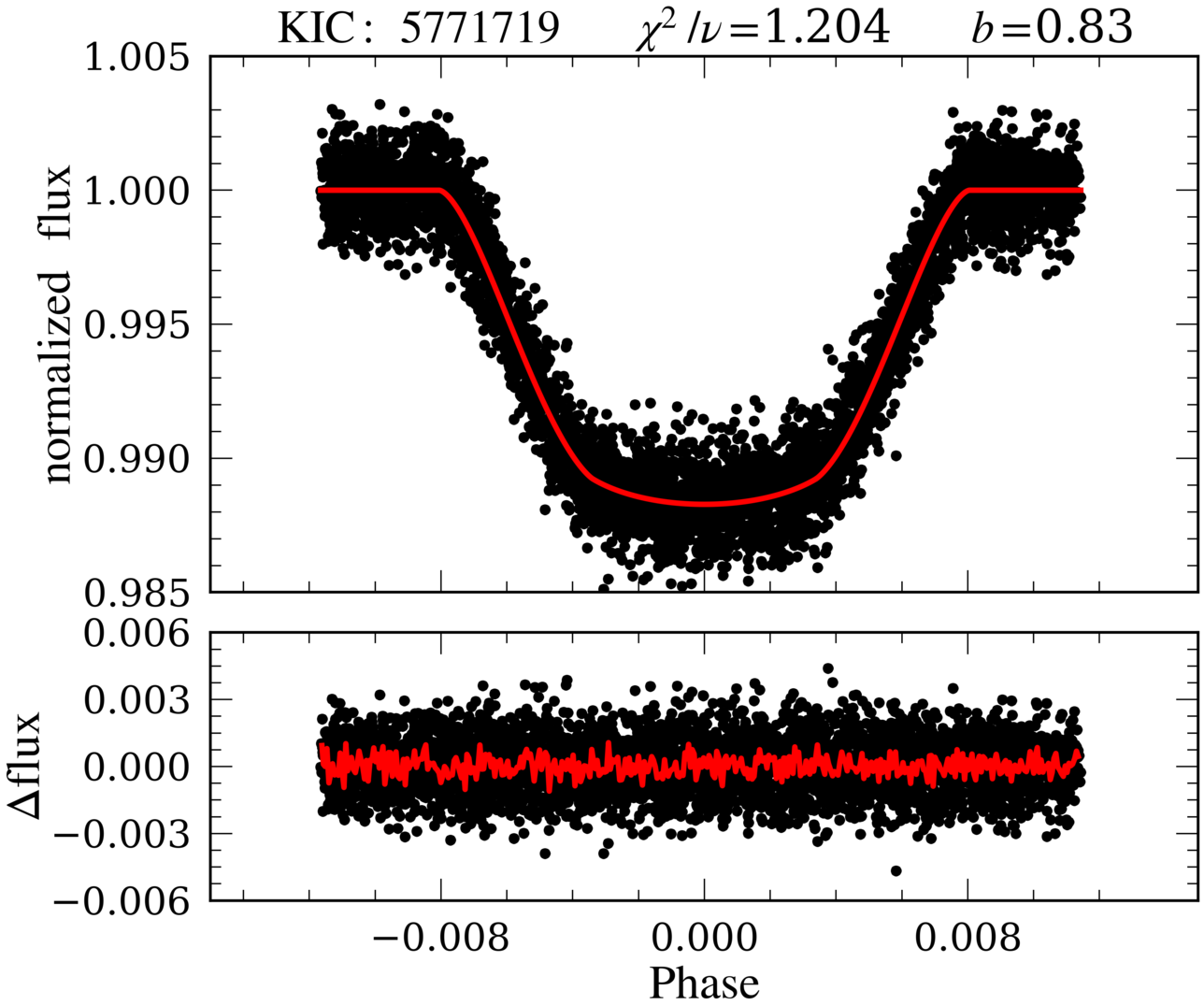Top panels: normalized, phase folded transit light curves and best-fit models for the object sample with high impact parameters (Table 2). Bottom panels: residuals for individual data points and overplotted rebinned residuals (red) with one minute bin time. Objects ordered by Teff from the upper left to the lower right corner.