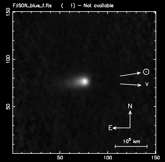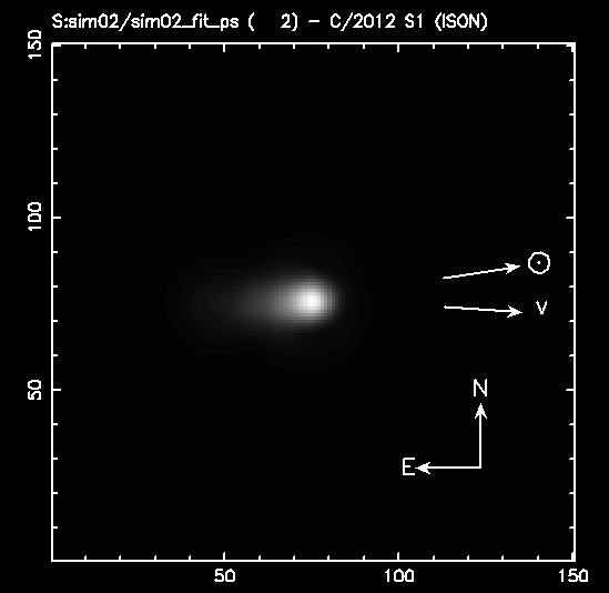 A comparison of the dust tail of comet C/2012 S1 (ISON) observed in the blue channel of PACS (left image) with a dynamical model of the dust tail (right image). For details of the model, see text. The direction of the Sun and that of the projected velocity vector of the comet are indicated with arrows. The axes units are in arcseconds.