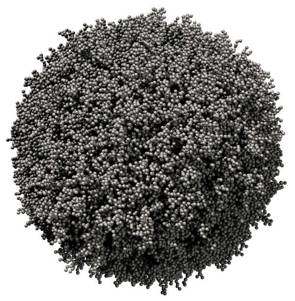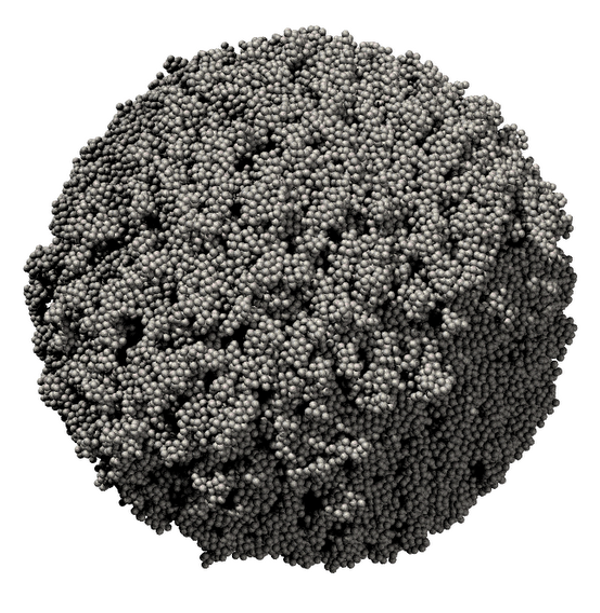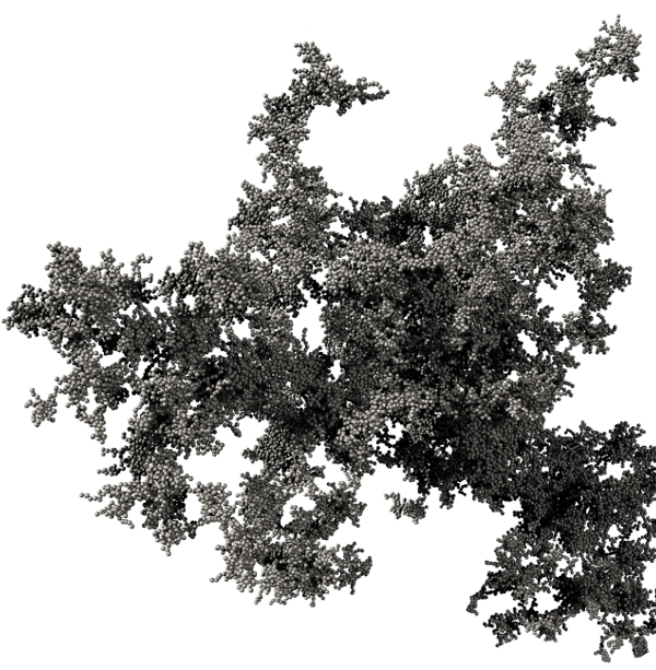Sample aggregates used in this work. Left: PCA aggregate (nc = 2) with 8 × 104 monomers and a diameter of 100 μm. Center: BAM aggregate consisting of 1.5 × 105 monomers with nc = 6 and a diameter of 100 μm. Right: fractal aggregate (nc ≈ 2) consisting of 6 × 104 monomers and a maximum diameter of ≈280 μm.