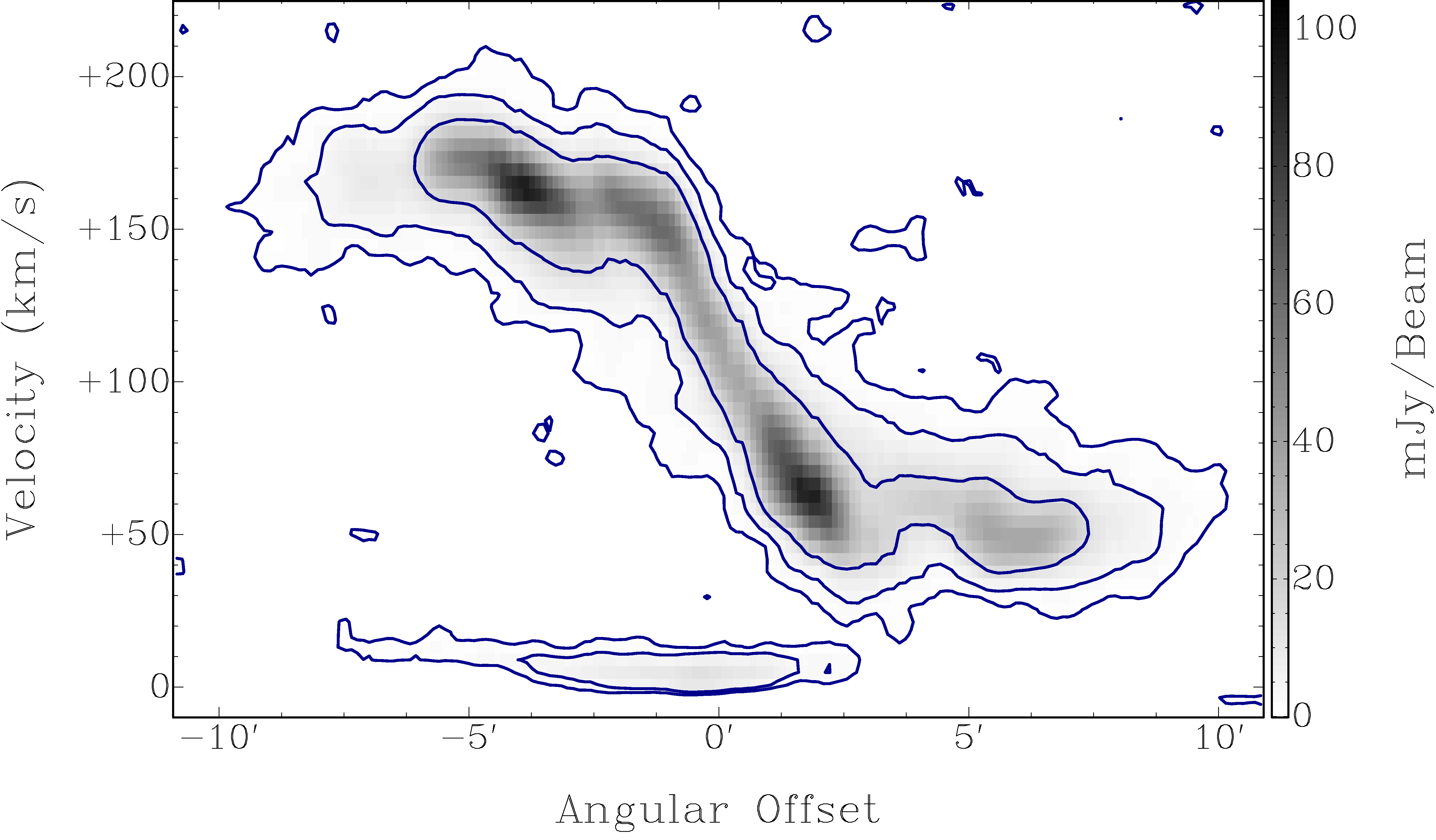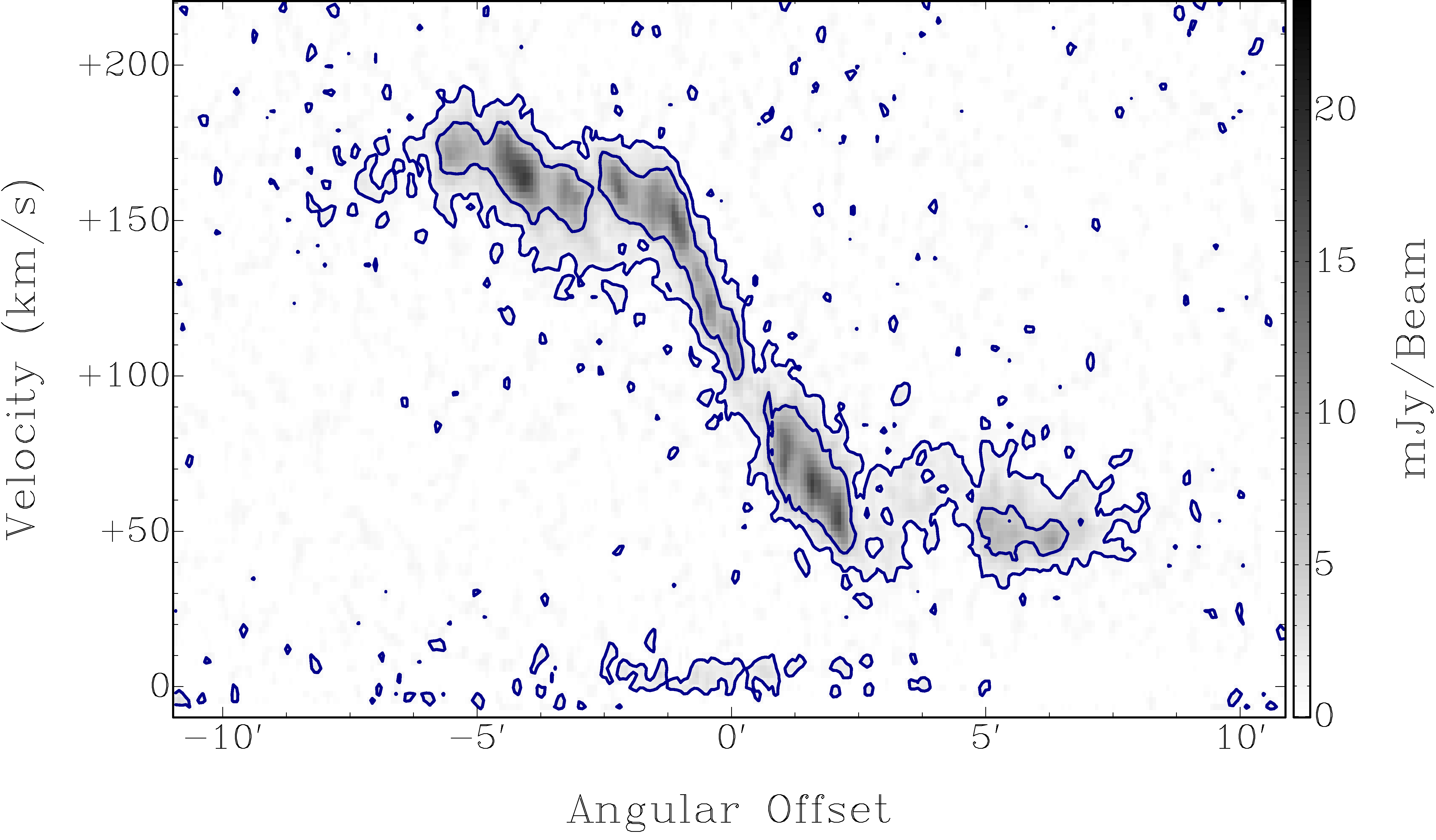 4.8 mJy beam-1. Right: position-velocity (PV) diagram