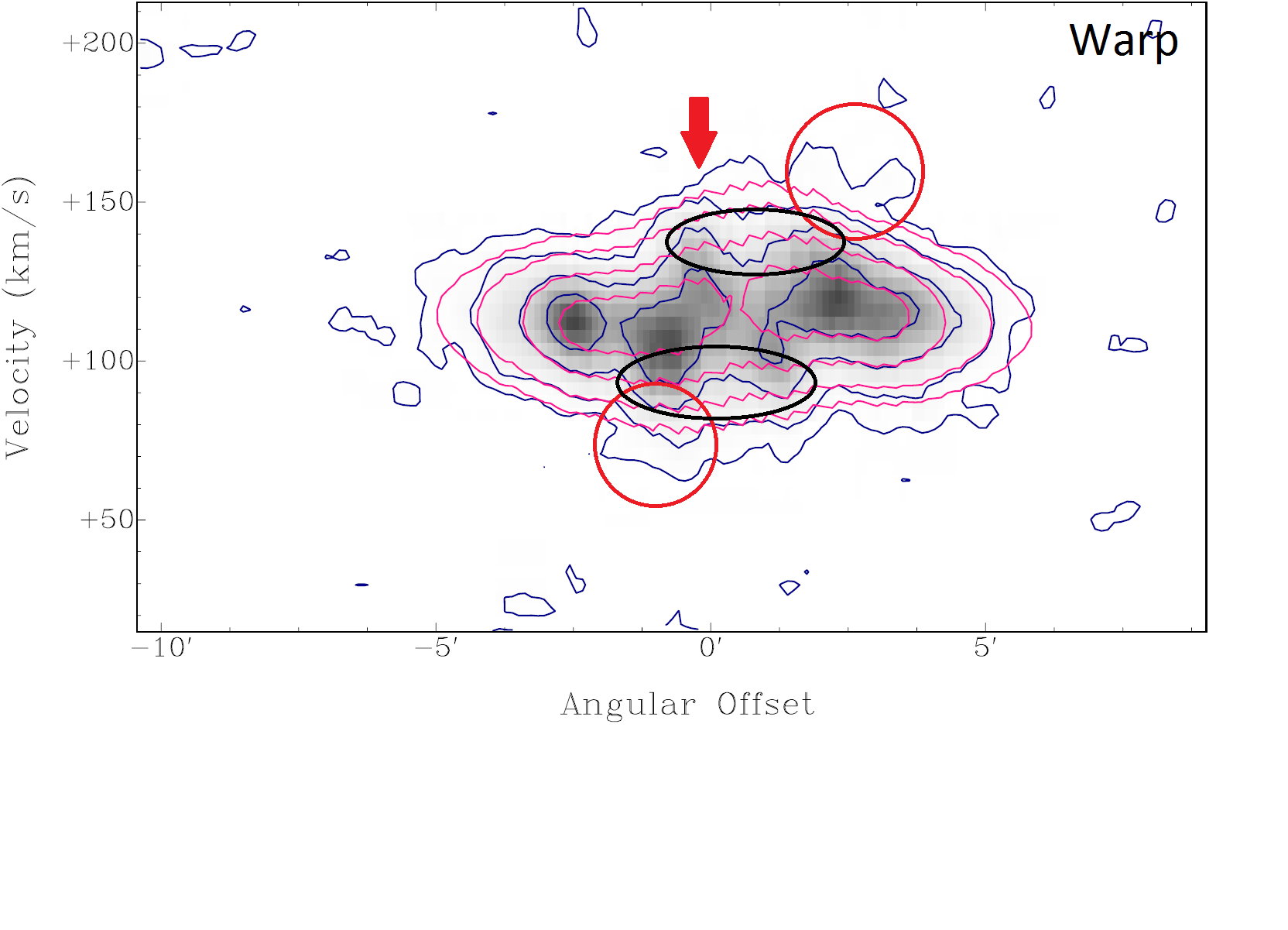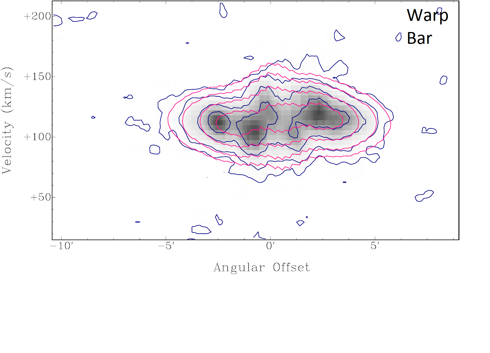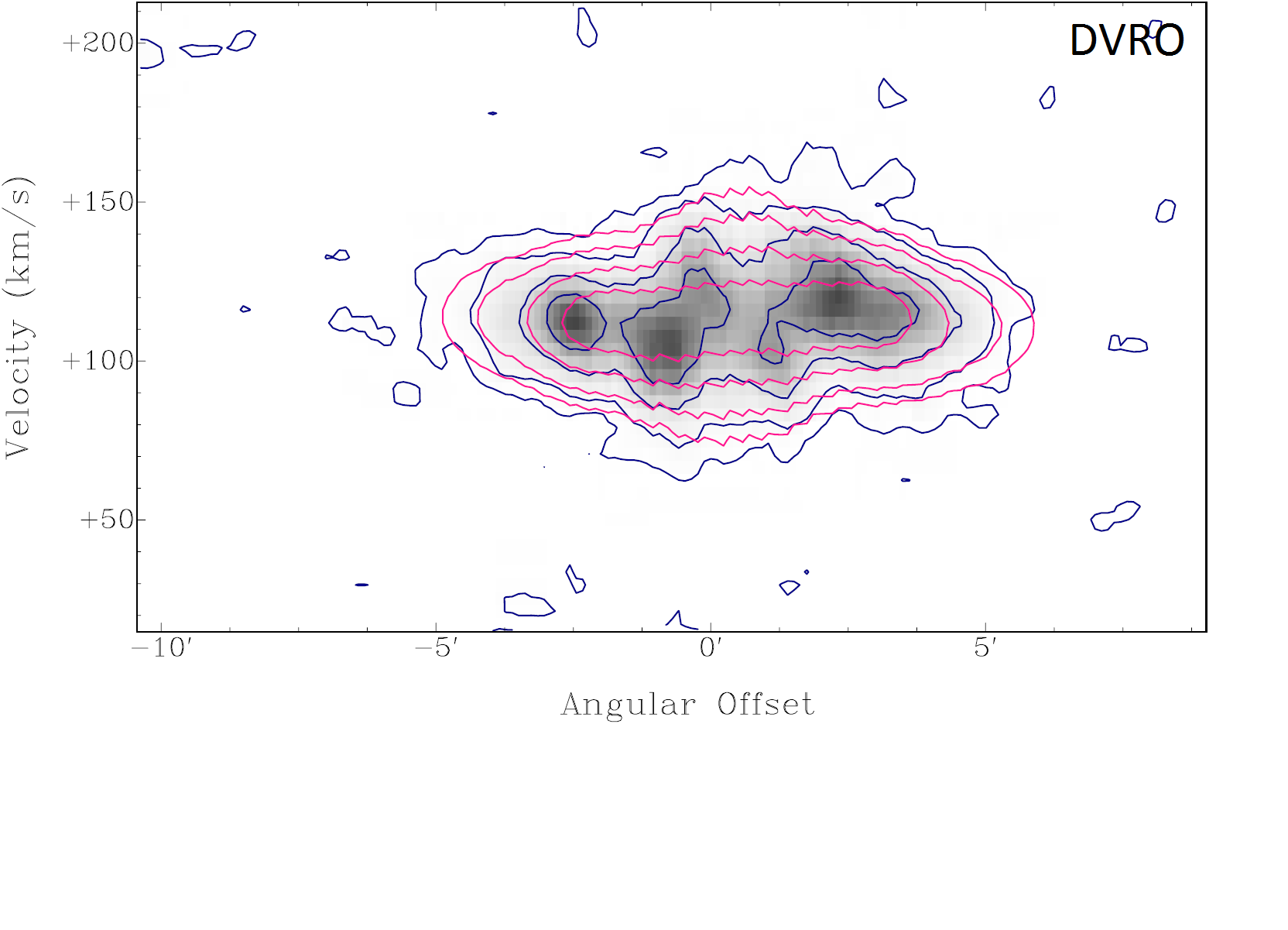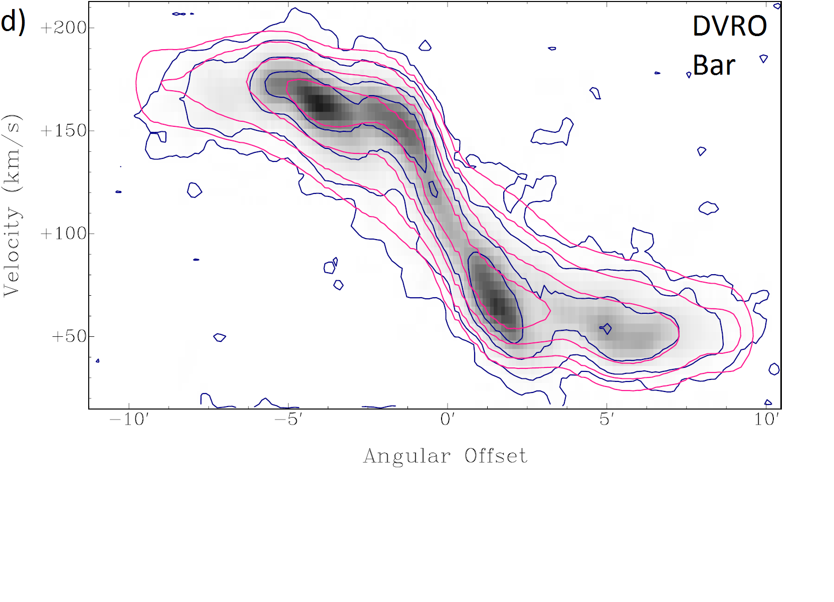 corresponding PV slices through different model cubes (pink contours). Contour levels