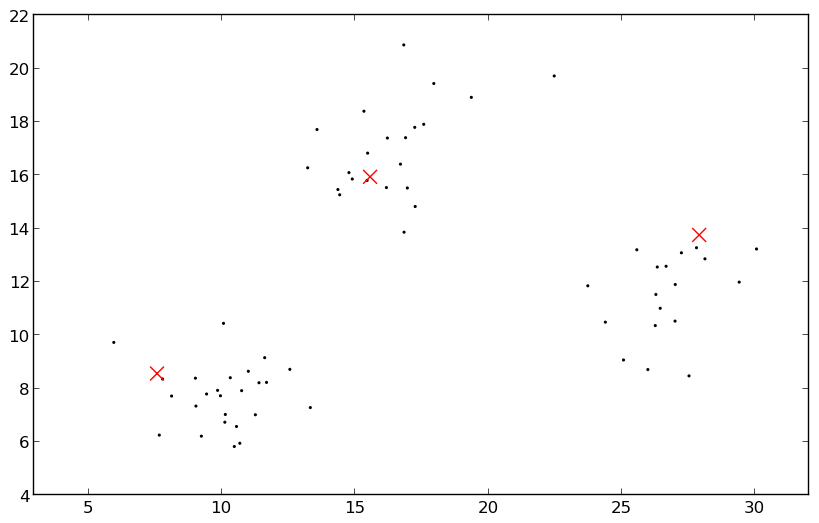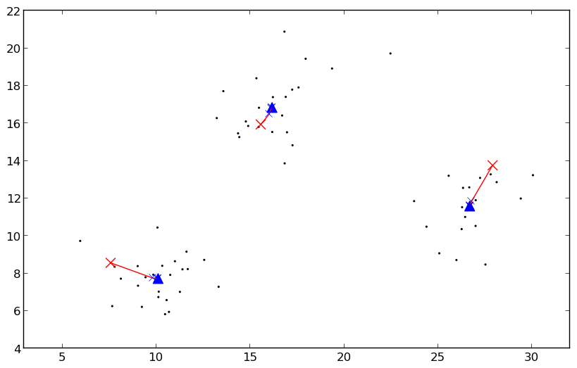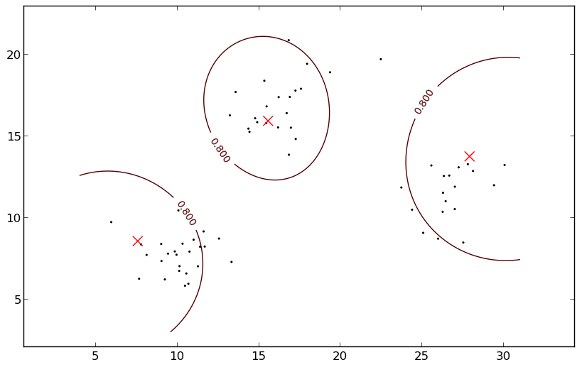 Illustration of several steps in the iterative procedure of FCM on a simple synthetic 2D dataset containing three clusters of data points. a) An initial center (red cross) is chosen for every class. b) In a first iteration, the membership values for every data point are calculated, considering the class centers. The contours delineate a membership value of 0.8. c) In a next step, the new class centers are calculated, considering the new membership values. After seven such two-step iterations, the class centers have converged to their final values, indicated by the blue triangles. d) In the last step, the final membership values are calculated, considering the final class centers. Note that both the final position of the centers and the final membership contours correspond much better to the three clusters than the initial ones.