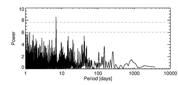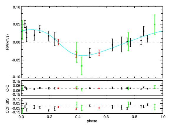Top: Lomb-Scargle periodogram for YBP1194. The dashed lines correspond to 5% and 1% false-alarm probabilities, calculated according to Horne & Baliunas (1986) and white noise simulations. Bottom: phased RV measurements and Keplerian best fit, best-fit residuals, and bisector variation for YBP1194. Black dots: HARPS measurements, red dots: SOPHIE measurements, green dots: HRS measurements.