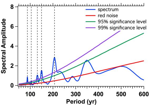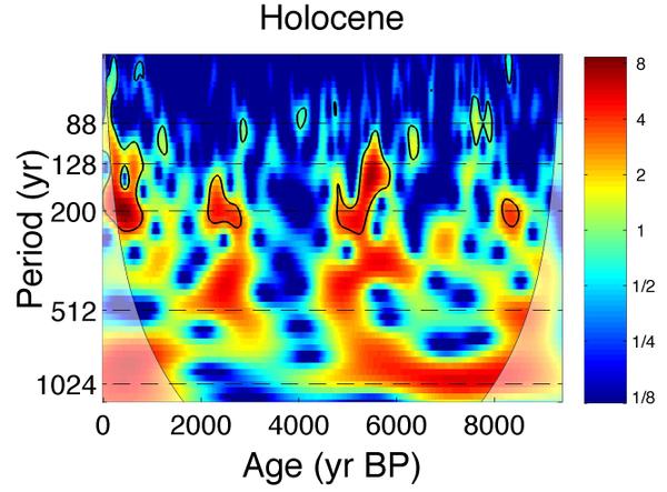 a) Wavelet and b) Fourier analyses of the composite from Steinhilber et al. (2012) during the Holocene.