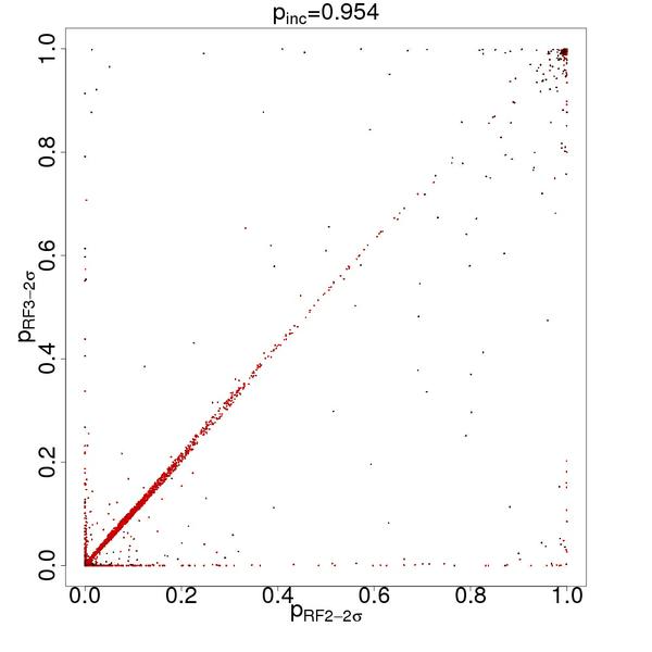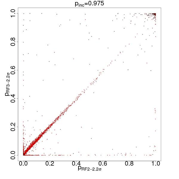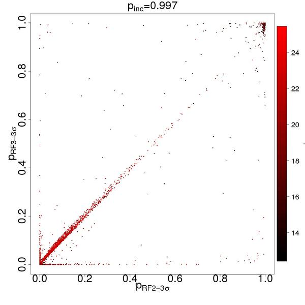 Scatter plots of the membership probabilities for the RF-2 versus RF-3 representation spaces for three values of the admission probability threshold pin = 0.9545 (2σ detection, left), 0.975 (2.2σ detection, middle), and 0.9975 (3σ detection, right). The colour code reflects the apparent i-band magnitude according to the colour scale to the right.
