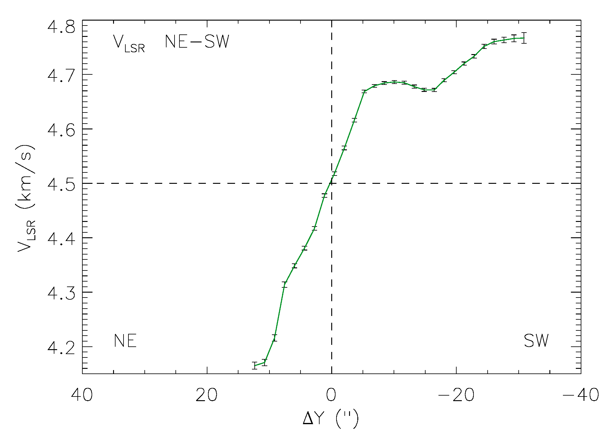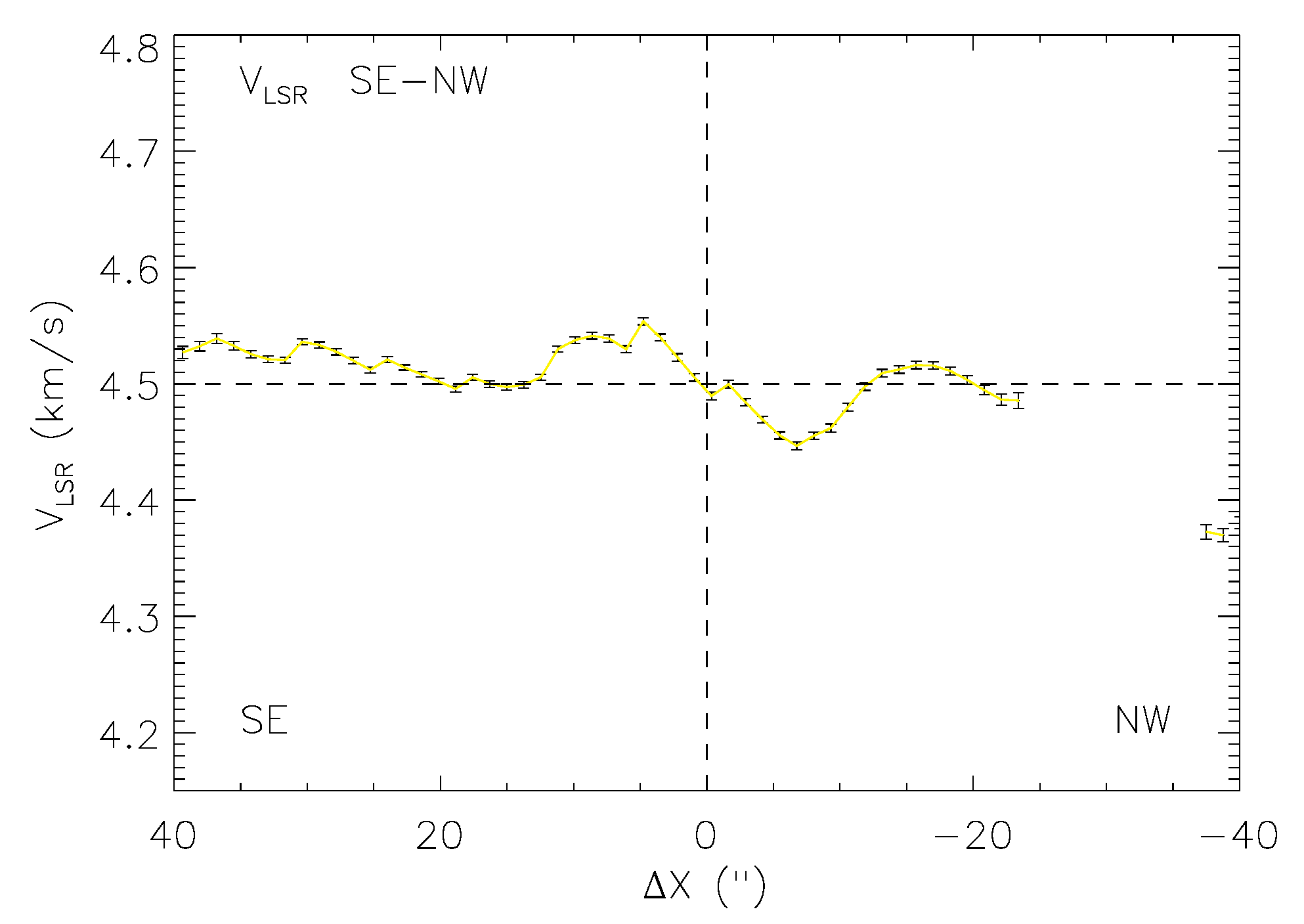 Distribution of the NH3(1,1) line velocities derived from Gaussian fits to the hyperfine structure. Top: the radial velocity map. The VLSR values can be read from the contours and the colour bar on the right. The locations of the Spitzer 24 μm source and the submm source Cha-MMS1a are shown with a triangle and a plus sign, respectively. Middle: velocity profile along the NW-SE oriented axis drawn in yellow on the map, Bottom: velocity profile along the NE-SW oriented axis indicated with green. Also the error bars result from Gaussian fits to the (1,1) hyperfine structure.
