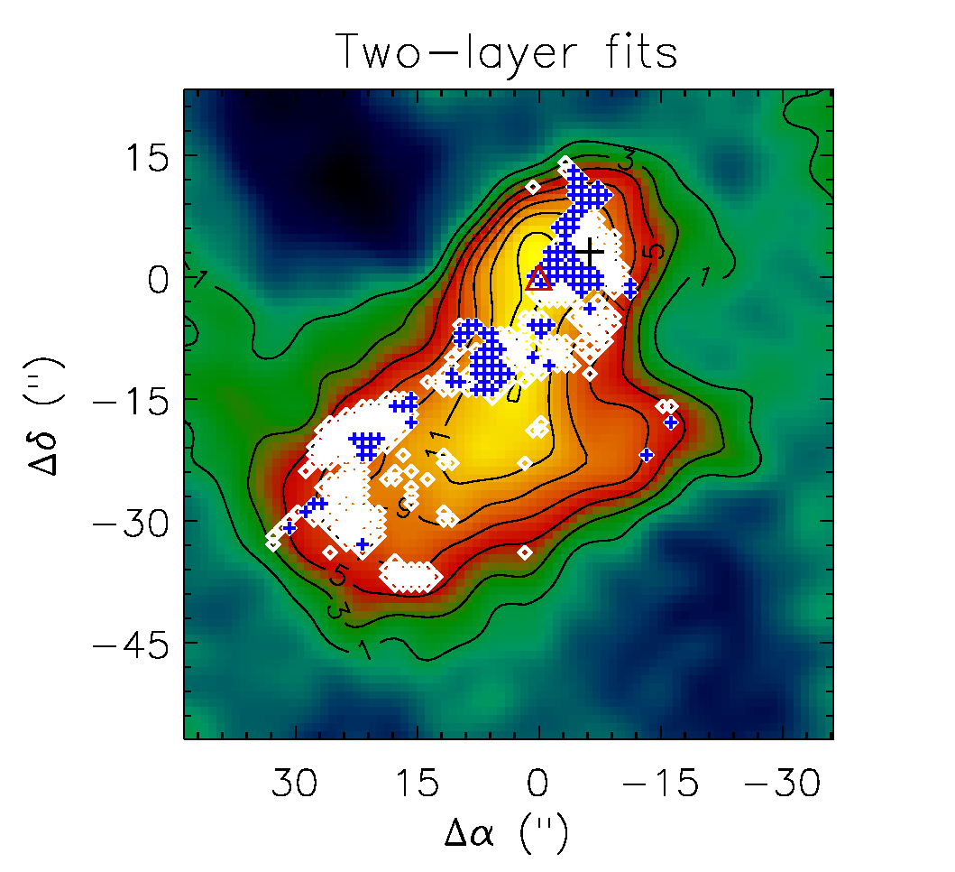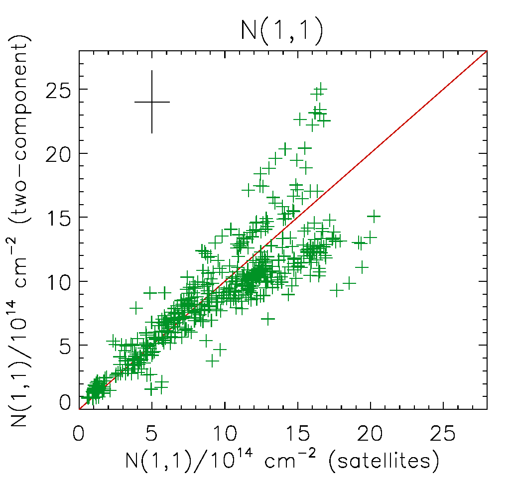 Top: the region where the two-layer fit (method C) is applicable is shown with white diamonds on the integrated brightness temperature map of the NH3(1,1) satellites. Blue plus signs indicate positions where Tex,bg> 11 K, i.e., where the excitation temperature of the background component exceeds the average kinetic temperature of the core. Bottom: comparison between the NH3(1,1) column densities derived by fits to the hyperfine satellites only (method B, x-axis) and two-layer fits (method C, y-axis). The average uncertainties of the points are indicated in the top left corner. The red line represents the one-to-one correlation.