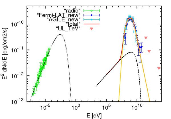 by synchrotron (dot) and bremsstrahlung (dashed) emissions; the IC contribution is