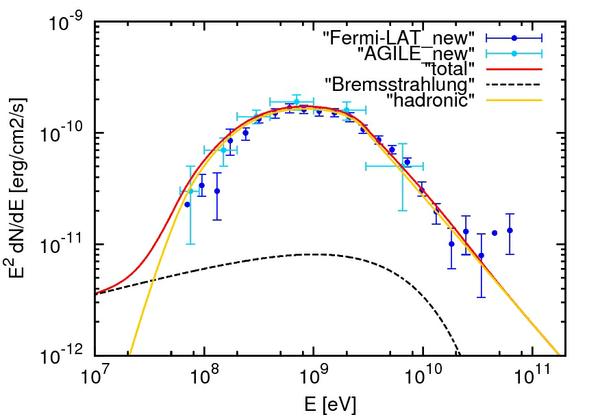 negligible. The red curve shows the total gamma-ray emission from pion-decay and