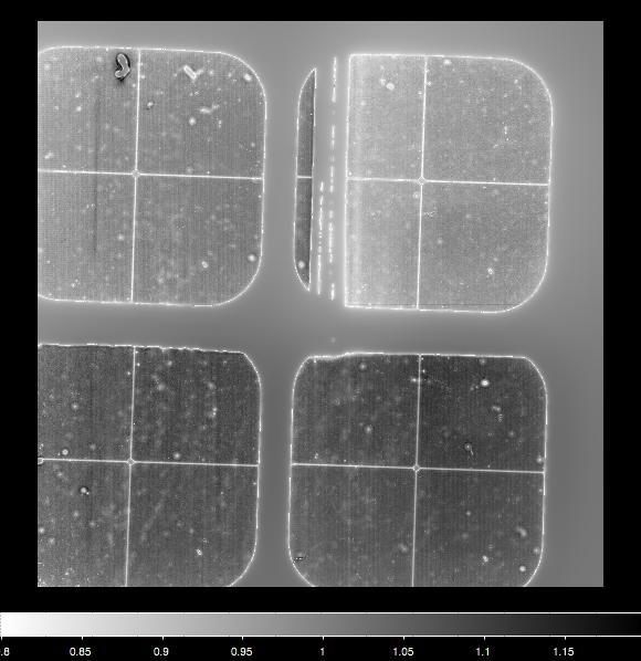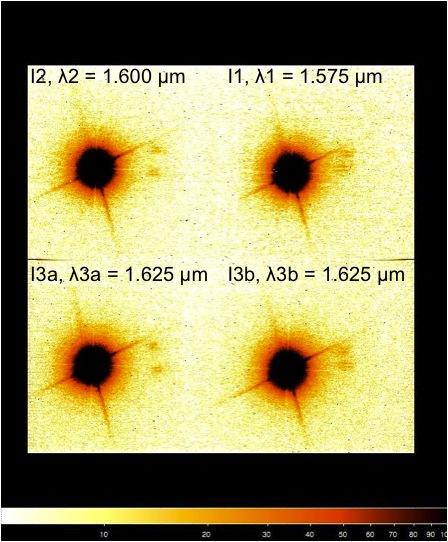 Left: single raw image of a target star provided by the SDI mode of NaCo. The wavelength of the four subimages is from the top right in the anticlockwise direction: 1.575, 1.600, 1.625, and 1.625 μm. The image is thresholded and the scale is logarithmic. Right: flat-field image of the SDI filters (the vertical bars of the filter support are visible in the top half of the image), the double Wollaston prism (which produces the four subimages) and the FQPM (the cross visible in each subimage). The image scale is linear. Both image sizes are 1026 pixels × 1024 pixels, and the field of view of each subimage is 8′′ × 8′′. The cut of the images seen on their left side is due to the position of the field selector on the light beam. Note the inverted tints of both images.