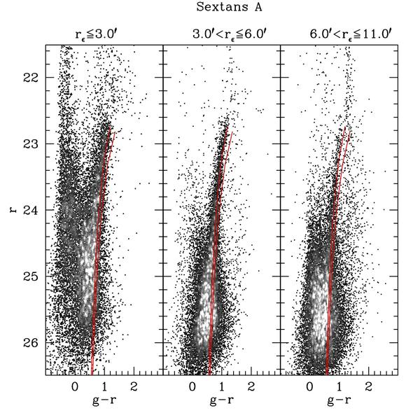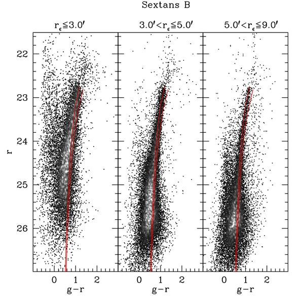 CMDs for Sex A (upper panels) and Sex B (lower panels) in different radial ranges. The red giant branches are compared with the ridge lines of the globular clusters M92 ([Fe/H] = −2.31) and M3 ([Fe/H] = −1.50), from left to right. In all the panels stars are plotted as black points in regions of the CMD with few stars and as grey squares otherwise, with the scale of grey proportional to the local density in the CMD. Lighter shades of grey correspond to higher density.