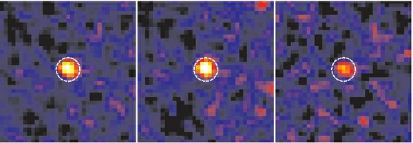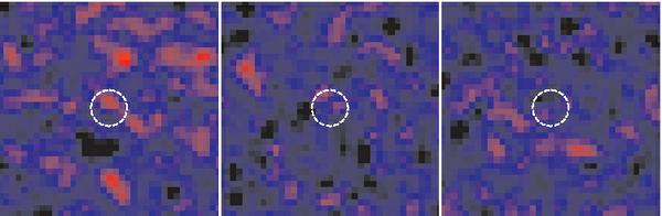 Upper row: stacked images of all GCs subsamples: left) all 618 GCs; center) 316 red GCs; right) 302 blue GCs. The central circle highlights the 3′′diameter region where most of the flux from the stacked LMXBs is concentrated. The images are produced through a sigma-clipped averaging algorithm with the clipping threshold set at 4σ. Lower row: same as the upper row, for 3 of the 100 samples simulated using random positions near real GCs (see discussion in text).