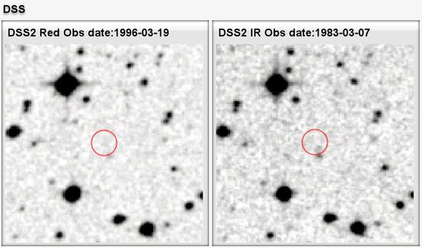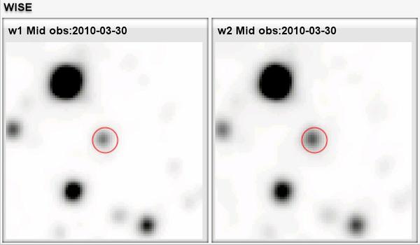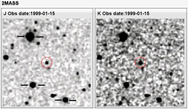 DSS R and I, 2MASS J and Ks, and WISE w1 and w2 finding charts (2 × 2 arcmin2, north is up, east to the left) for WISEA J0647−1546. Circles are centred on target position at the 2MASS epoch. Three reference stars (see text) are marked in J band.