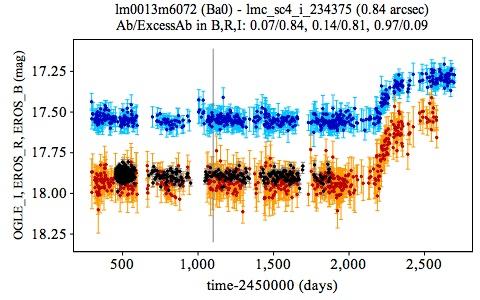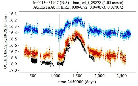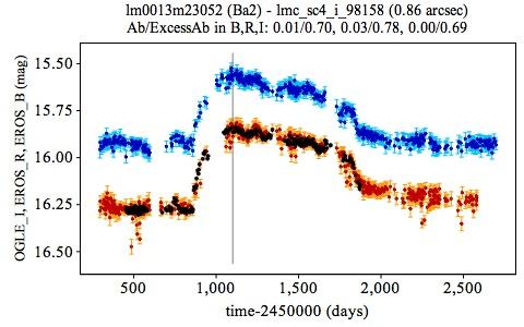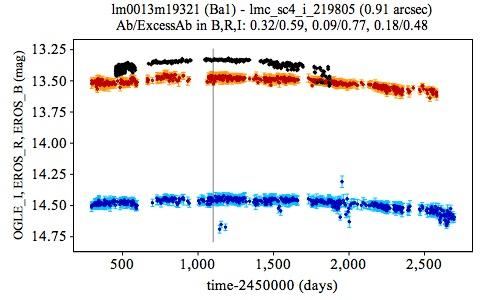 Light curves of EROS transient candidates with outbursts (type Ba) in blue/red for the BEROS/REROS photometric band. The light curve of the matching OGLE-II source is superposed in black. The vertical gray line locates the starting time (1100 d) of partial light curves considered in the paper.