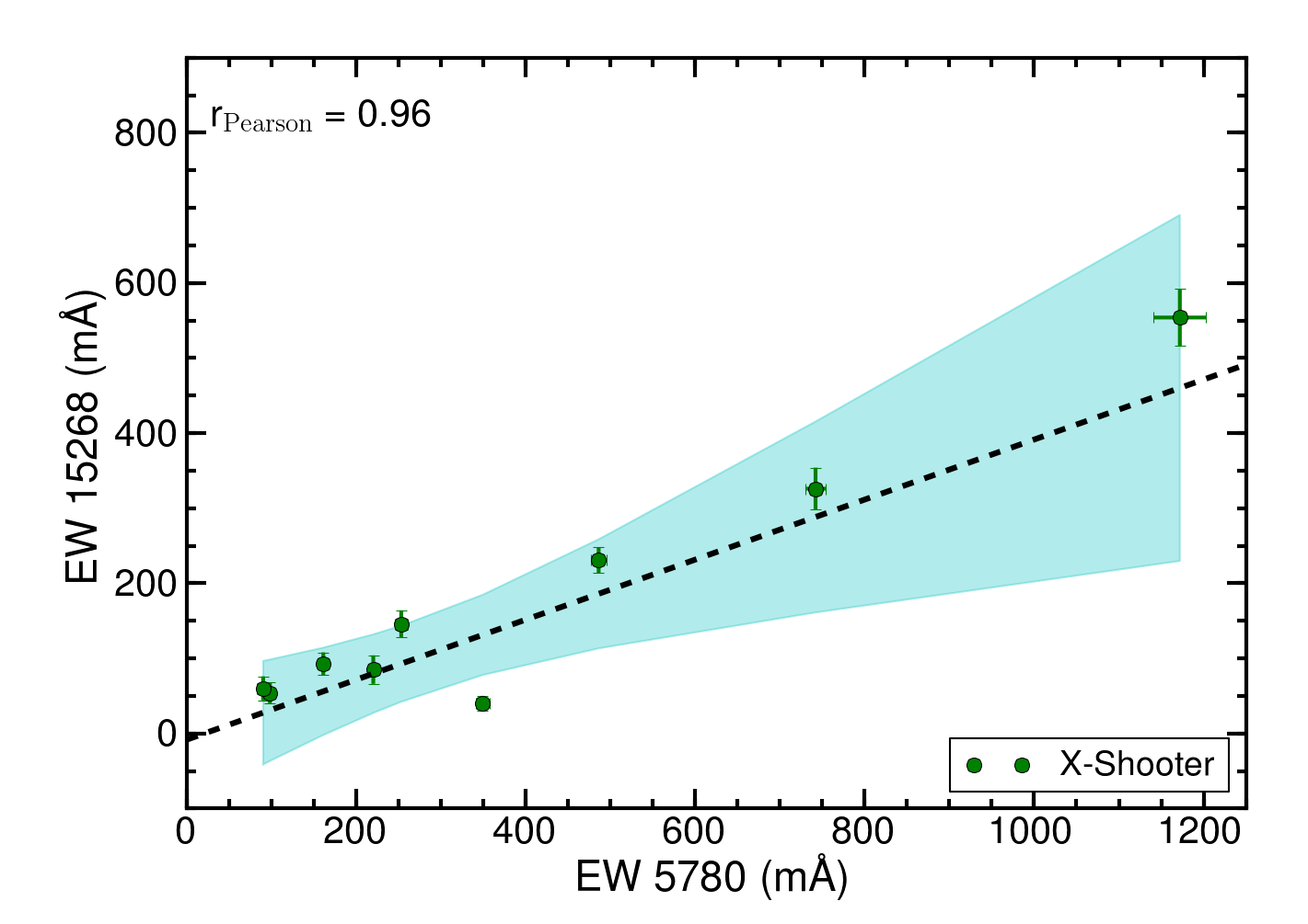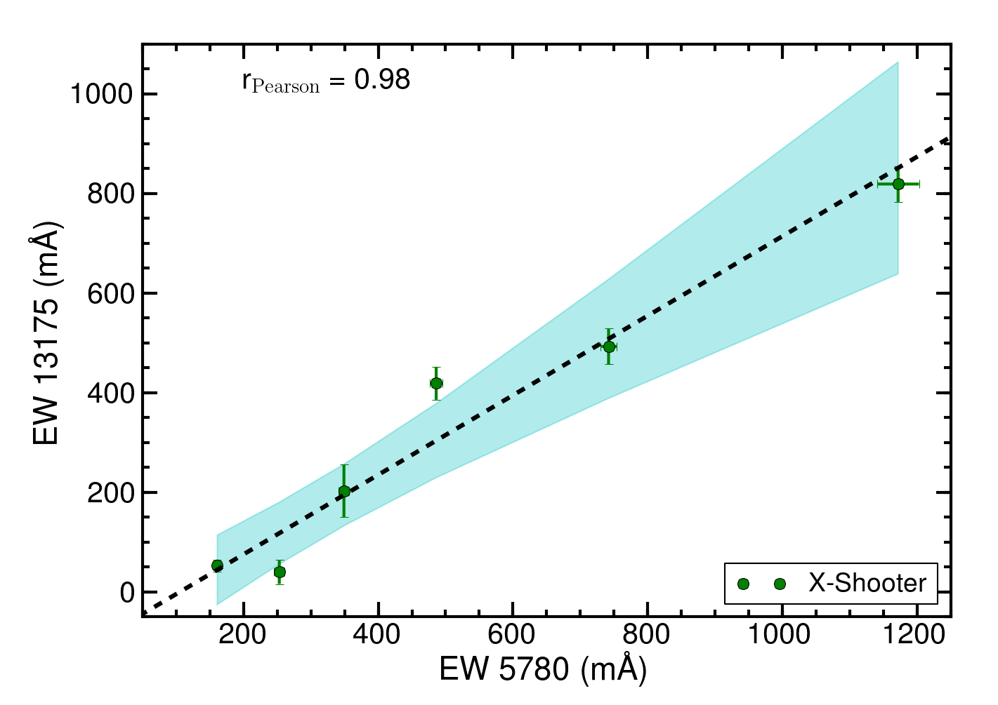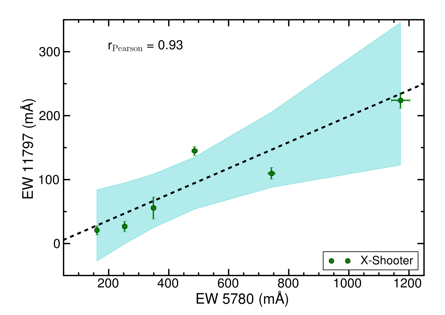 Mutual correlation between the 5780 Å DIB and the λλ 11 797, 13 175, and 15 268 NIR DIBs. The correlation coefficients are given in each panel. The linear least-square fit is indicated by the black dashed line (parameters are given in Table 5) and the shaded cyan area indicates the 95% confidence interval.