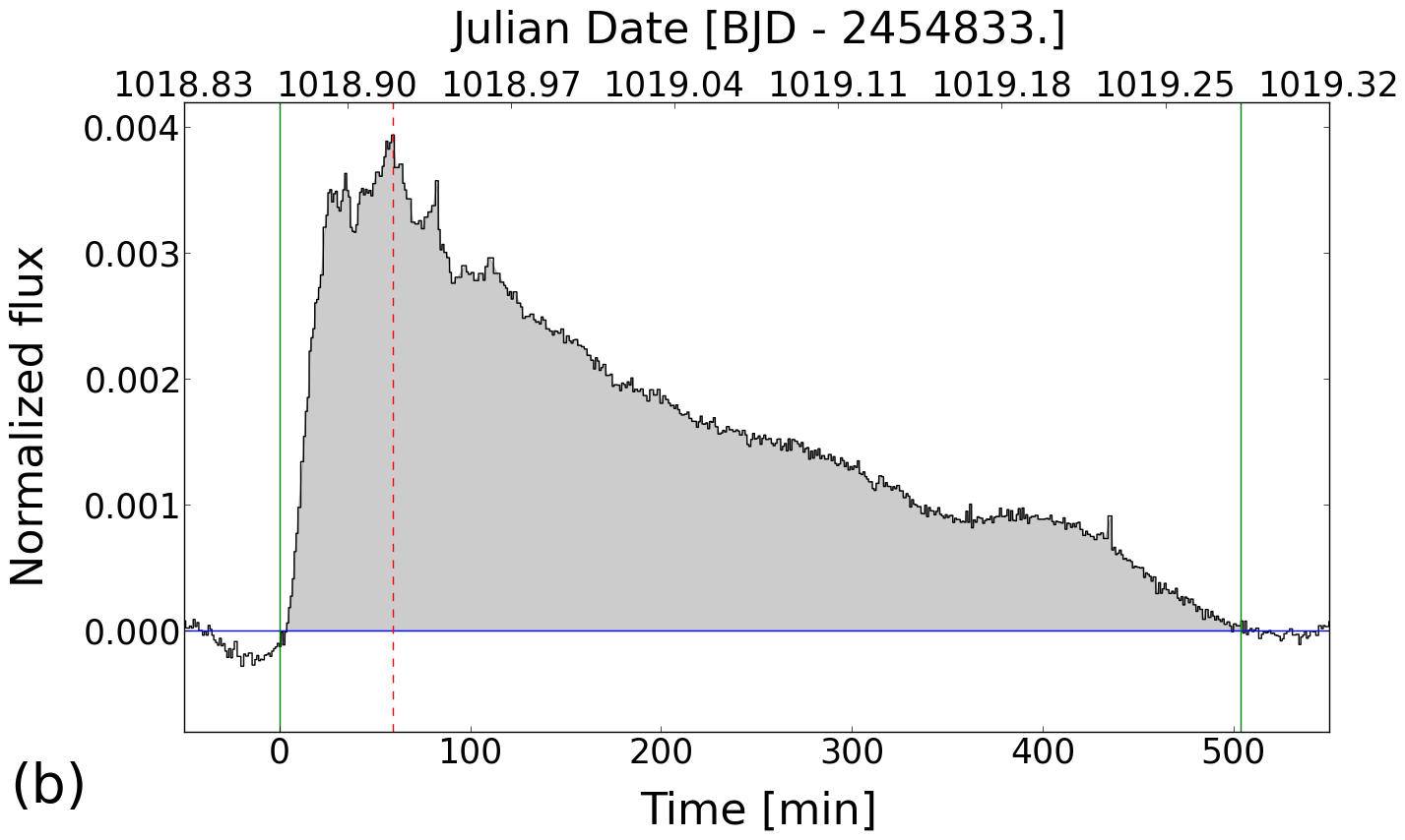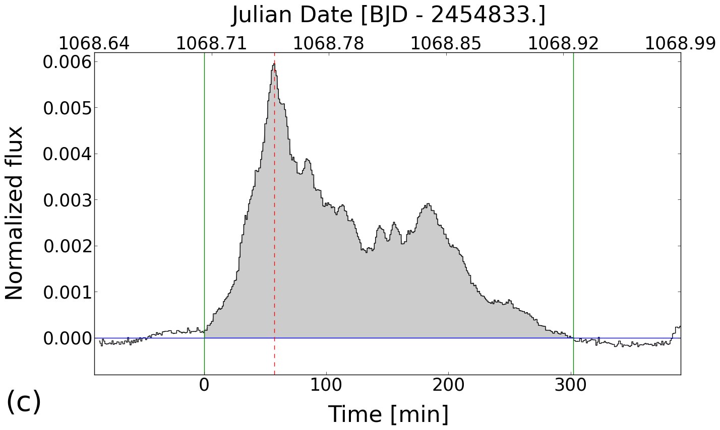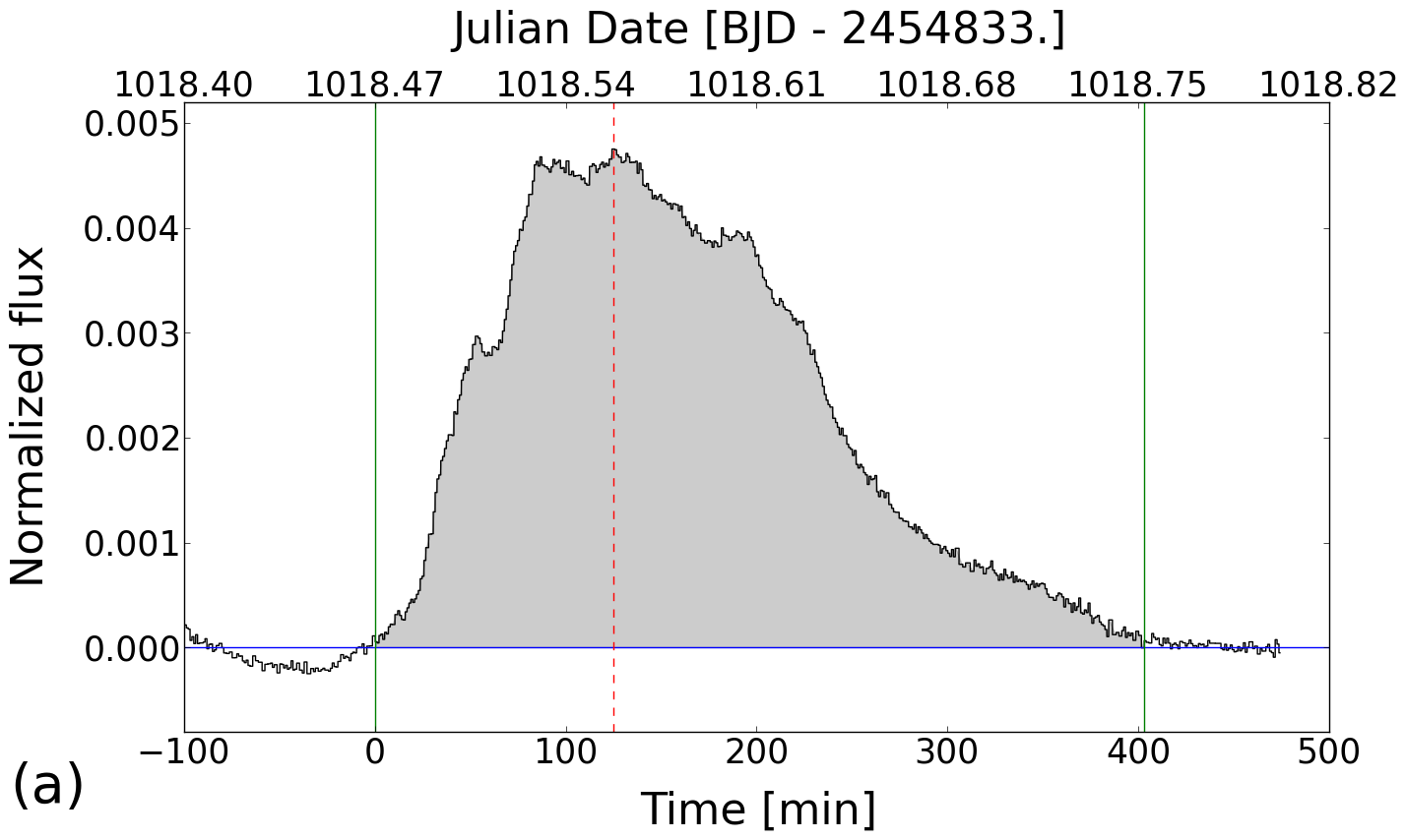 White-light flares observed by Kepler. The solid (green) lines indicate the start and end of the flares and the dashed (red) line the point of maximum flux.