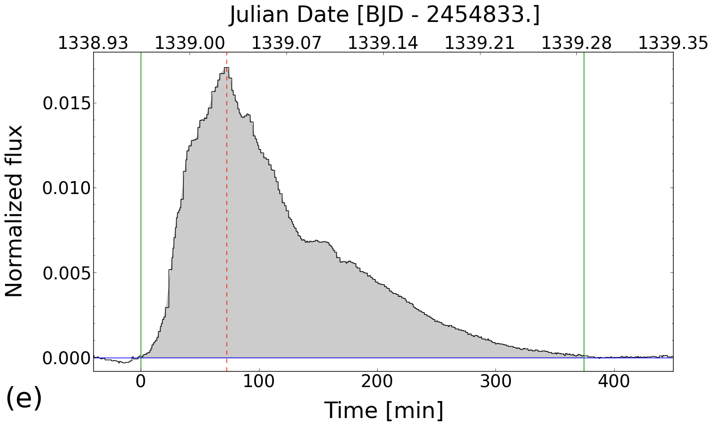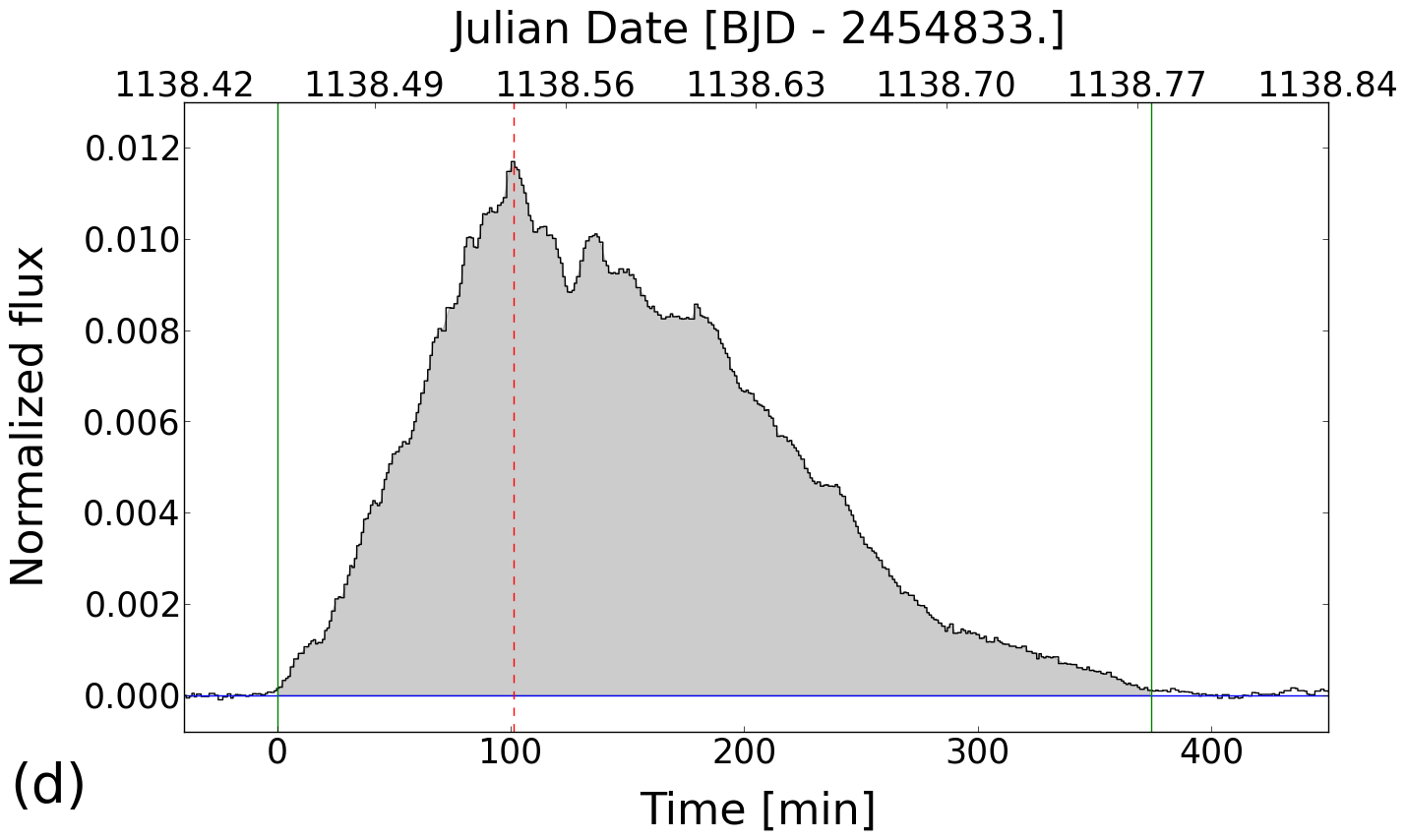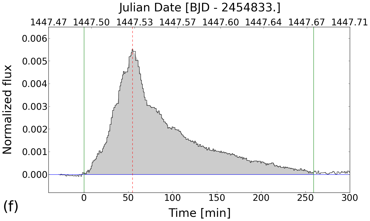 White-light flares observed by Kepler. The solid (green) lines indicate the start and end of the flares and the dashed (red) line the point of maximum flux.