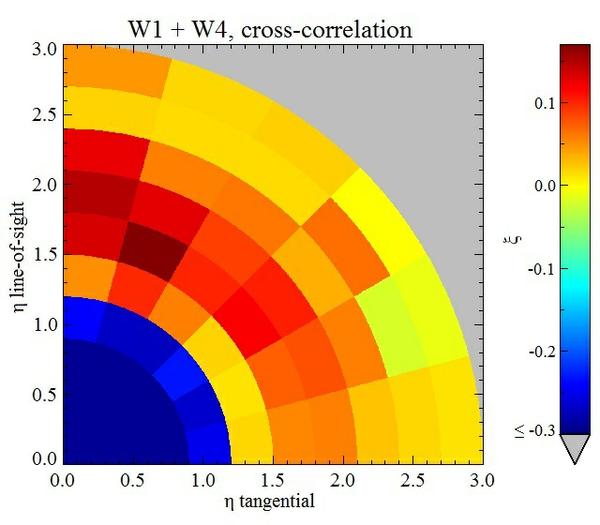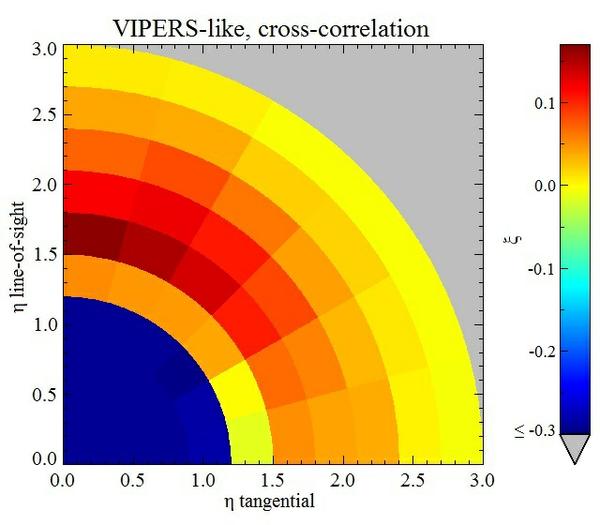 Void-galaxy cross-correlation function, as measured in the mock catalogues (left panel) and in the VIPERS data (right panel). Measurements were made in ten radial bins and in six angular bins. The axes plotted correspond to the tangential, θ, and line of sight, π, directions. The enhancement in the line of sight direction, visible in both the mock catalogues and in the data, is evidence of redshift space distortions caused by linear outflows.